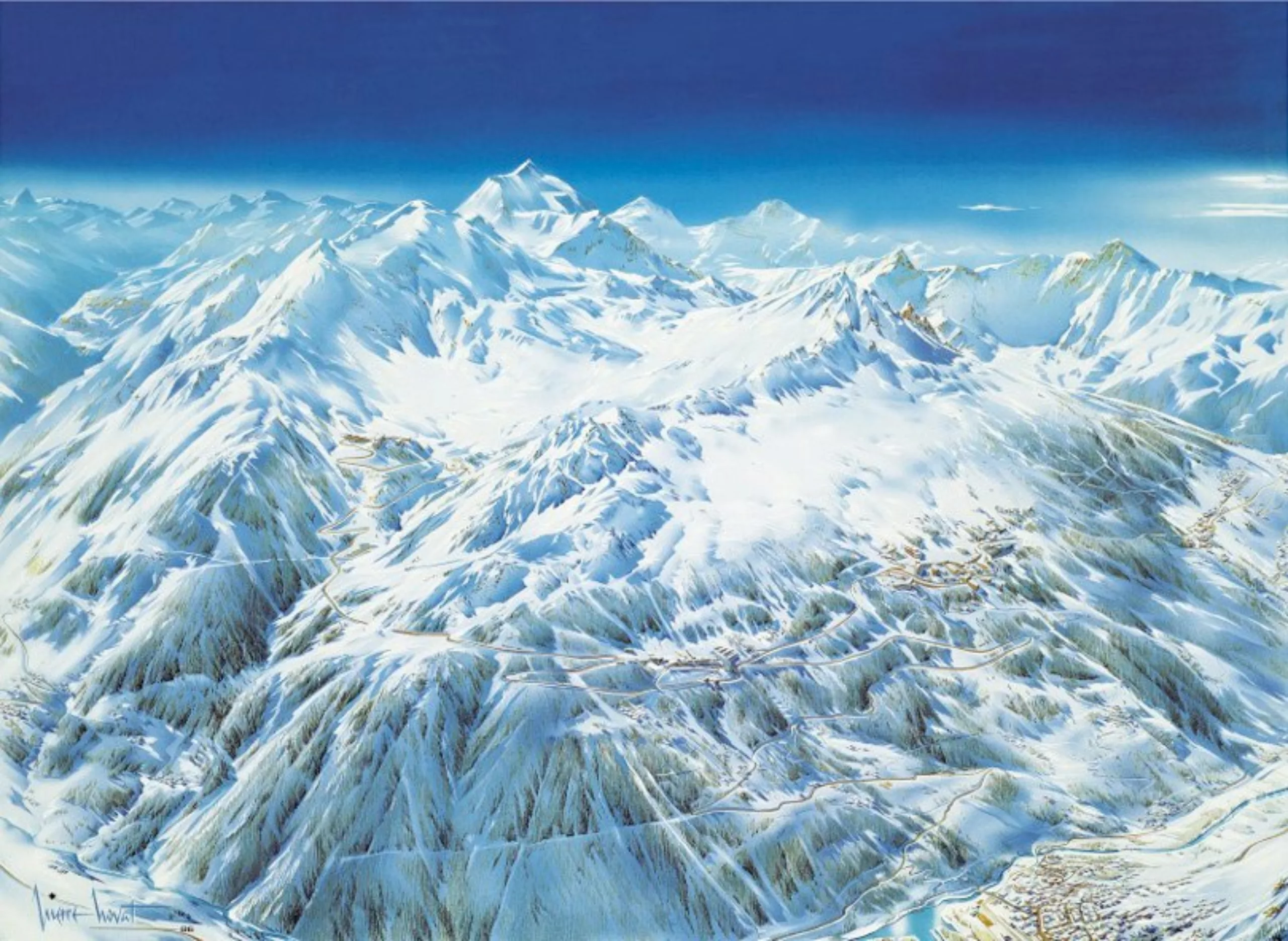 The ski trail designer distorts, flattens and recreates a skiing area that is more or less close to reality by manipulating the convergence lines. It beautifies the resort for skiers. It is therefore impossible to rely only on Google Earth or a simple photograph, otherwise a few parts of the mountain would disappear. Some companies like Kaliblue now offer their digital services, but without ever equaling the artist’s blueprint.