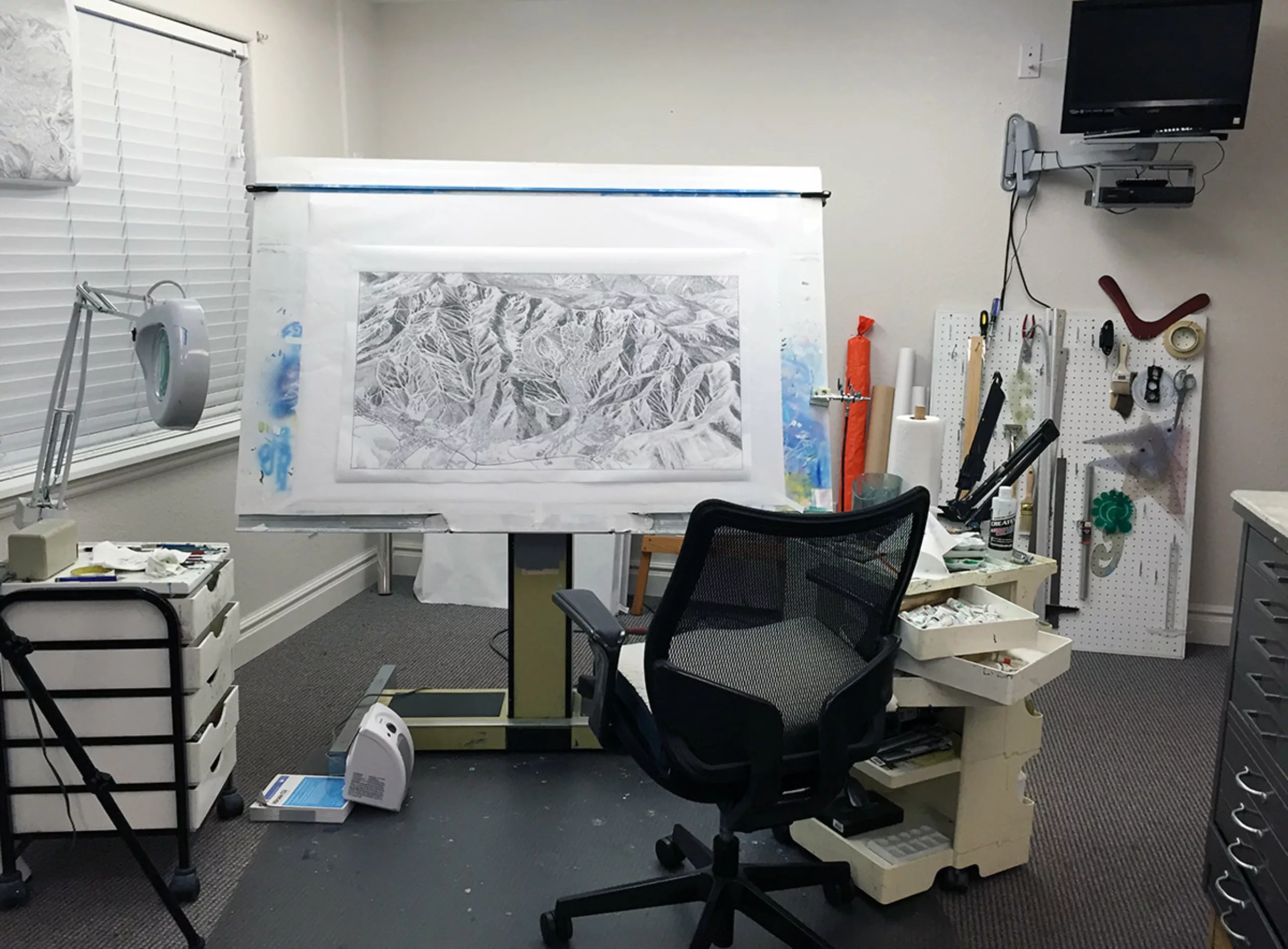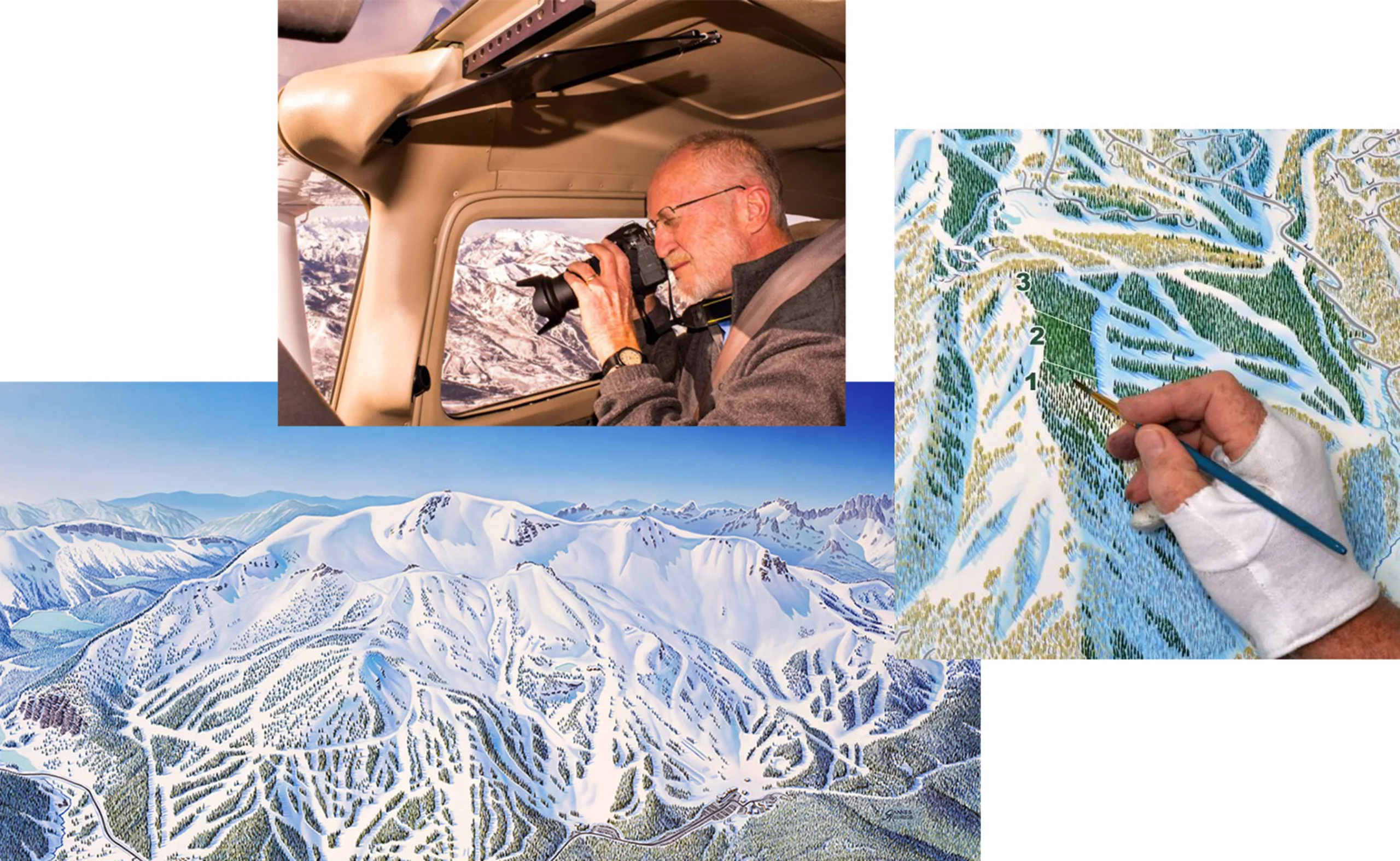 Just like Novat, Jim Nieuhes thinks like a skier rather than an illustrator to create perfect runs. “The best way to illustrate the trails is to interpret the sliding experience.” To avoid the hazards of seasonal orders and the associated wage dips, Nieuhes takes orders 3 months in advance. One should count between $3,500 and $15,000 per map, several weeks of work, plus the rental cost for an airplane or helicopter.