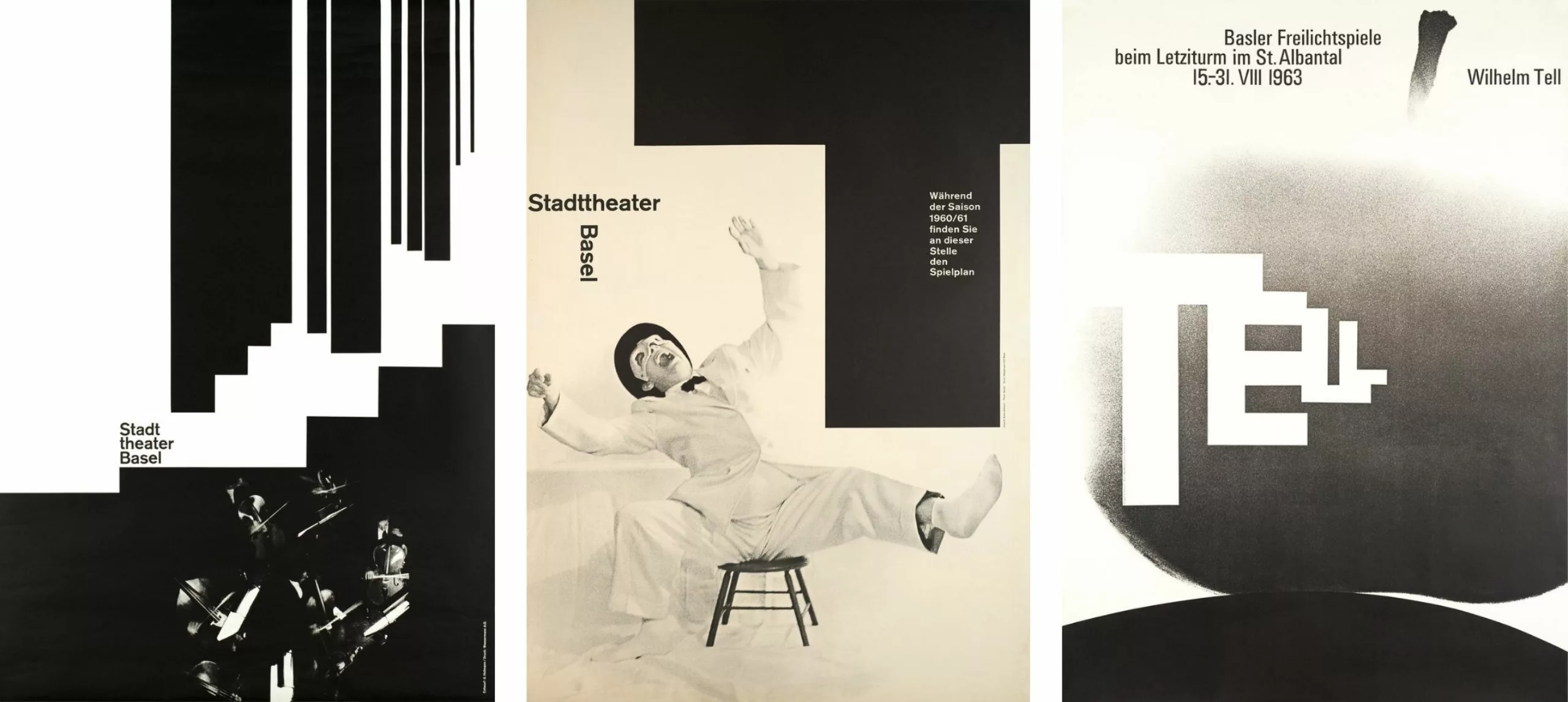 Deux affiches d’Armin Hofmann, une des figures de proue de ce qu’on a appelé l’École bâloise, se distinguent. La première pour le Stadttheater Basel, récompensée par le Prix de l’Affiche suisse en 1960. Une affiche noir et blanc, à l’image de la rigueur d’Hofmann. Une typographie très présente, très graphique, surplombant un personnage en équilibre instable.