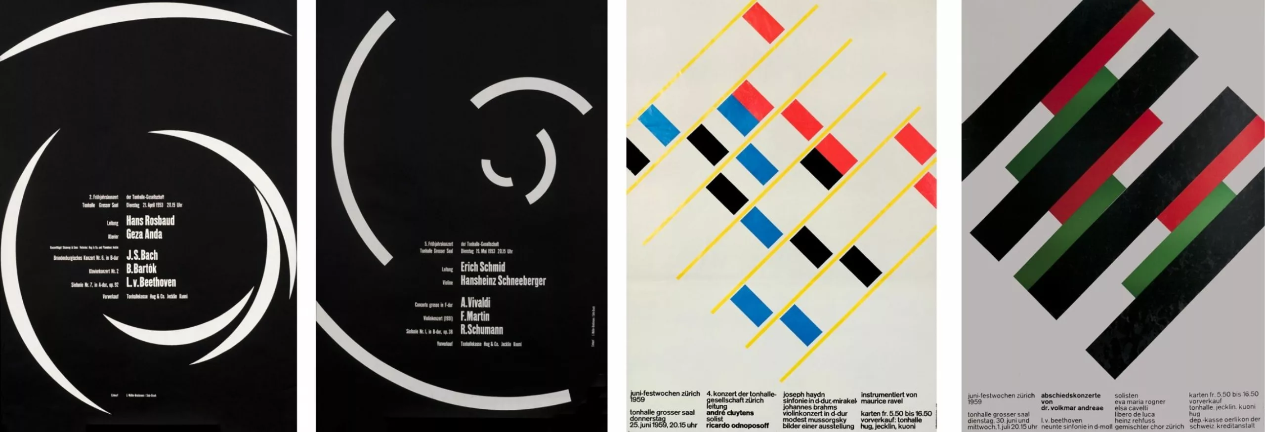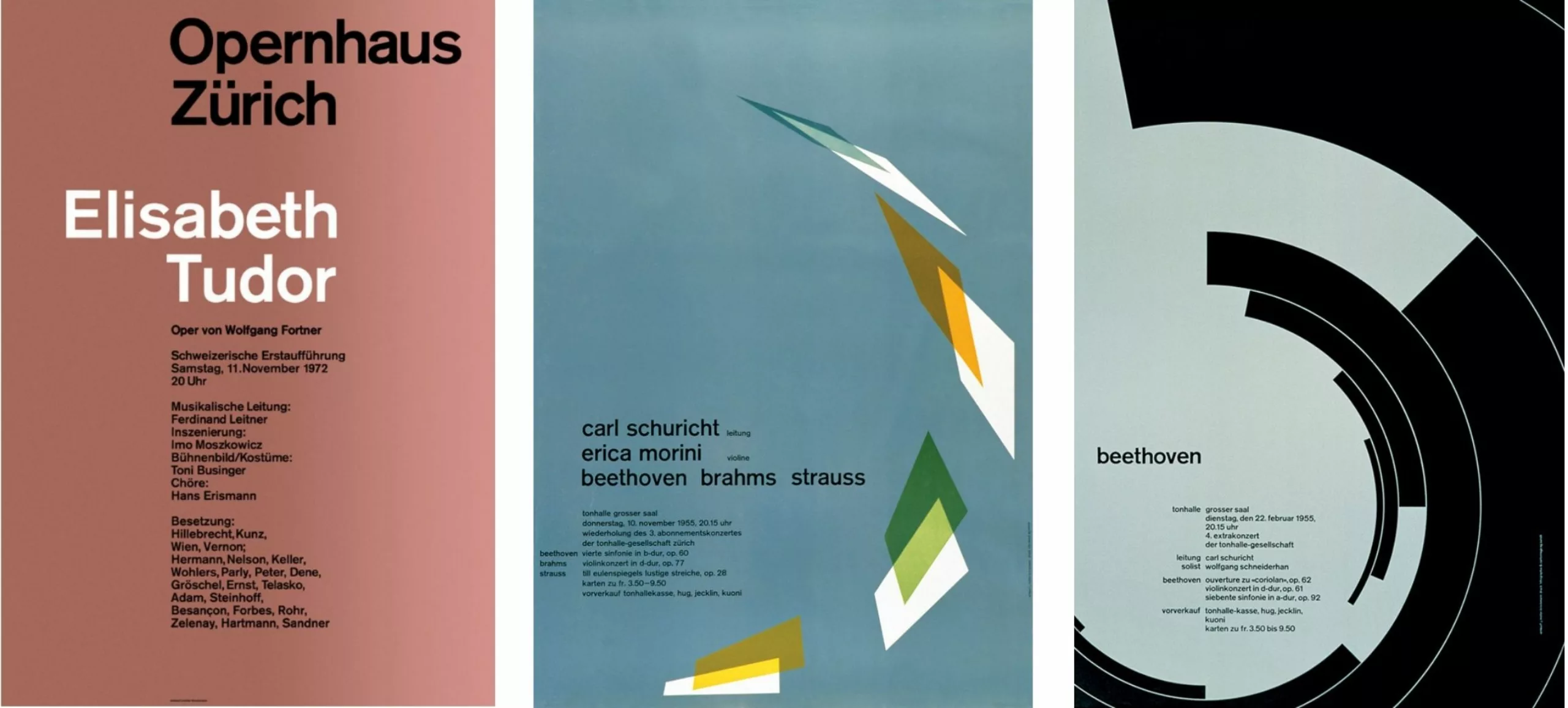 Autre figure incontournable, Josef Müller-Brockmann, réalisera une série d’affiches de théâtrepour l’Opernhaus Zürich qui préfigure avec un demi-siècle d’avance l’approche contemporaine de certains théâtres publics parisiens (on pense au travail de ter Beckke & Behage pour la Colline et l’Odéon).