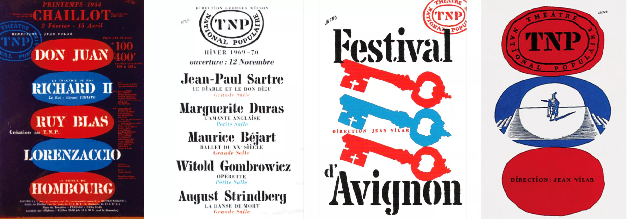De 1951 à 1972, ce sont pas moins d’une centaine d’affiches que Jacno va réaliser pour l’homme de théâtre. « Notre entente était parfaite, rapporte Jacno dans son livre de souvenir, “Un bel avenir”. Le choix des projets d’affiches se décidait en tête à tête. Sans intervention étrangère, sans referendum. […] Je posais mes dessins par terre, sur le parquet. Vilar, debout à mon côté, en robe de chambre, examinait, mûrissait son opinion. “Il faut que ça saigne !” disait-il. »