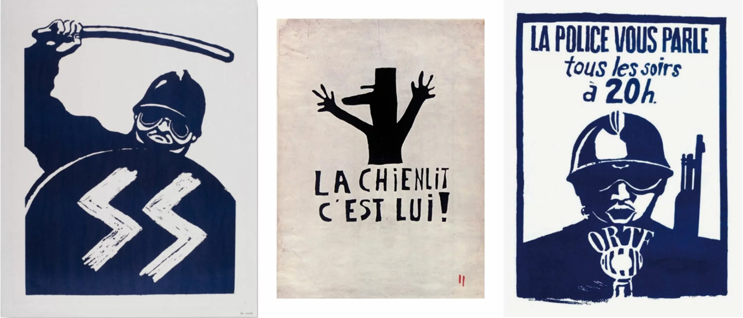 “Cours camarade, cours, le vieux monde est derrière toi !!!” Bientôt, mai 68 viendra mettre le feu avec une explosion d’affiches produites par l’Atelier populaire des Beaux-Arts de Paris et l’Atelier des Arts Décoratifs. Chaque jour, de nouvelles affiches sérigraphiées, envahissent les murs de la capitale. L’engagement politique trouve dans le support papier une raison d’être. Une écriture graphique va naître.