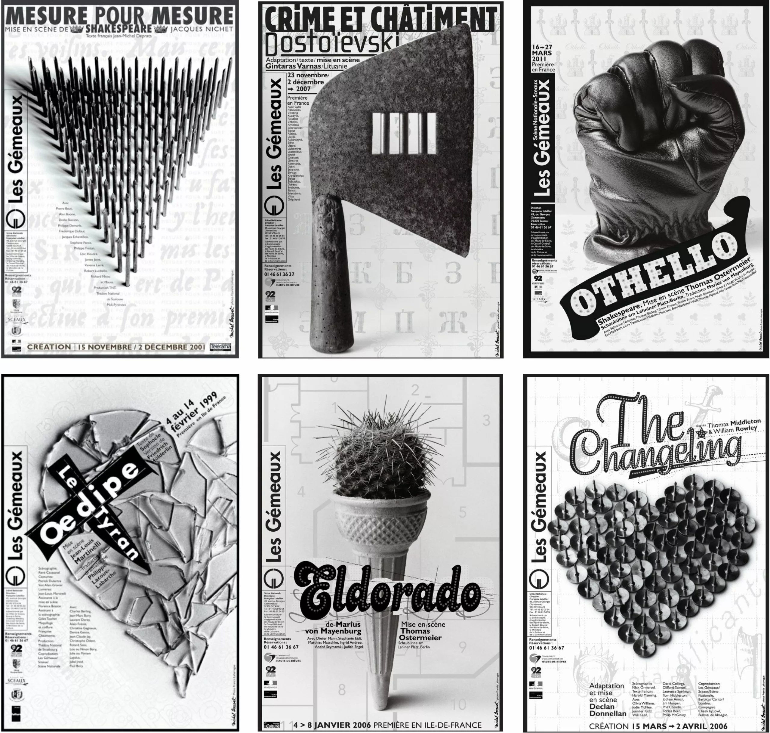 Pour “Othello” par exemple, il met en valeur un poing ganté du Black Power, référence au geste de Tommie Smith à Mexico en 1968, et questionne ainsi le texte pour en proposer une actualisation toute personnelle. Pour les Gémeaux, l’image est généralement accompagnée d’un travail typographique propre à chaque affiche.