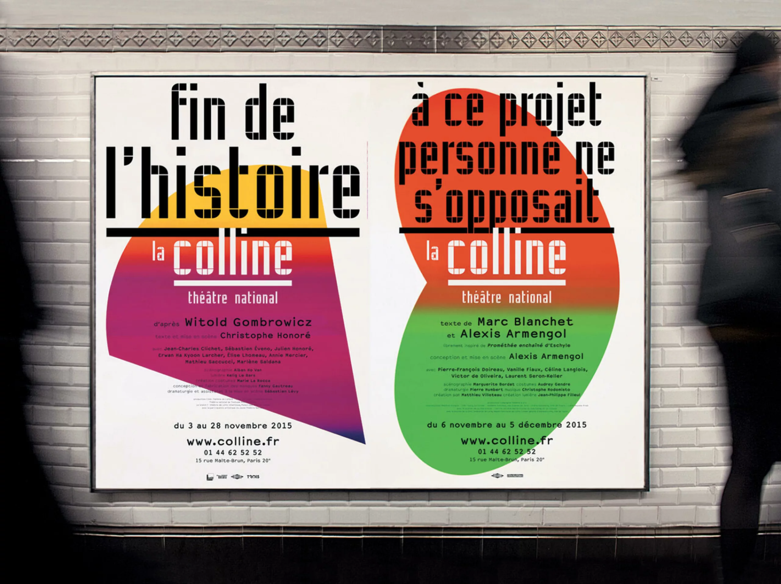 Pourtant, à l’issue des premiers rendus peu convaincants, la déception oblige le théâtre à s’interroger sur sa demande. Le doute s’installe, et l’équipe de la Colline décide alors de contacter l’atelier Evelyn ter Bekke & Dirk Behage (qui a réalisé la communication de la Maison Européenne de la photographie). En l’espace de 3 semaines, les deux graphistes néerlandais esquissent un projet qui sera validée par la direction. C’est leur premier projet de communication pour un théâtre et c’est une réussite saluée par tous les acteurs de ce domaine.