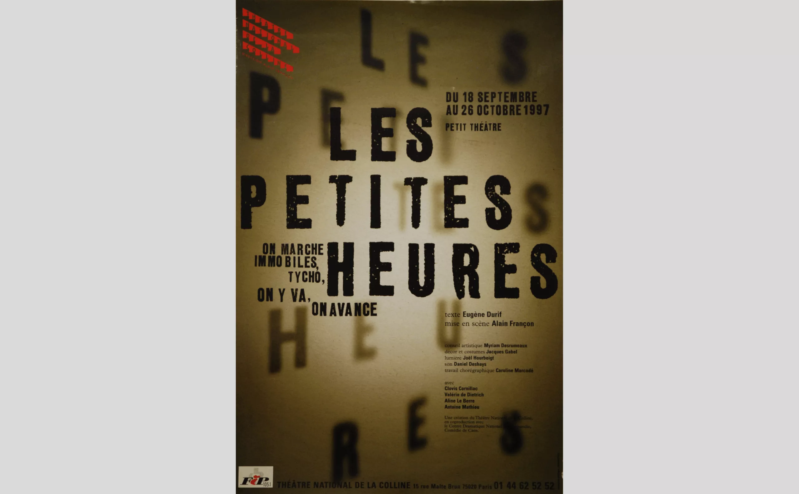 Ce que l’on sent poindre avec la nomination et la volonté d’Alain Françon, c’est l’apparition d’un 4e point de vue, celui du théâtre et de l’institution qui souhaite prendre plus de place. Au final, Alain Françon choisira l’agence Atalante et Xavier Barral. La première affiche d’Atalante annonce “Les petites heures”, en septembre 1997, pour l’ouverture de la saison.