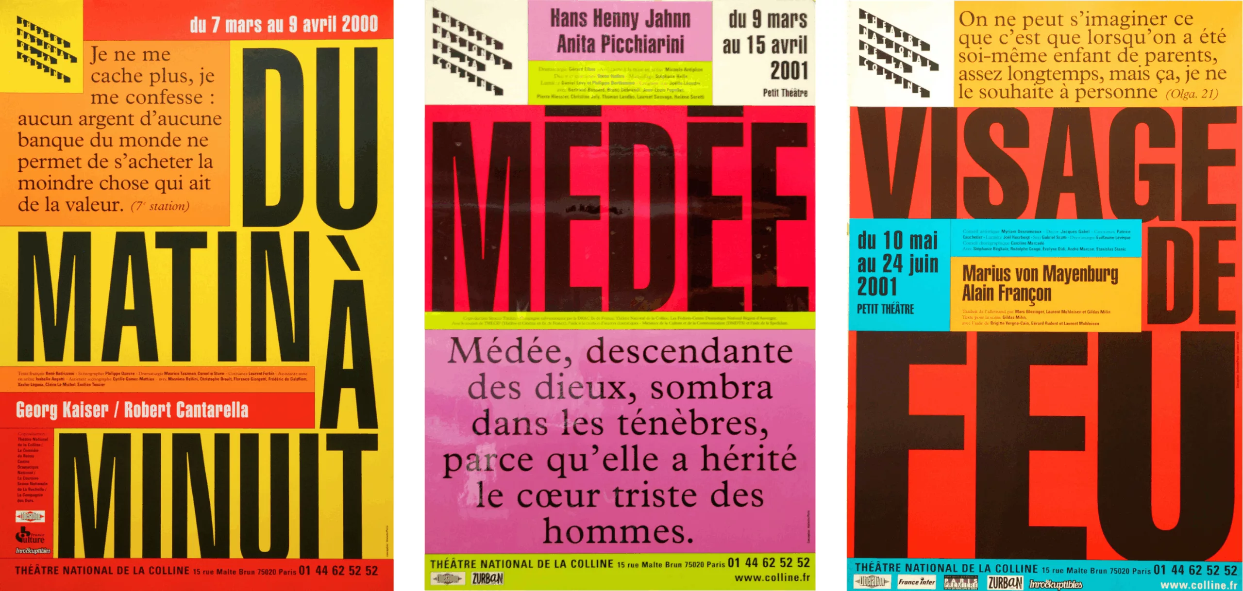 Novembre 1996. Alain Françon est nommé directeur du théâtre de la Colline. Il s’agit pour lui de changer radicalement l’image publique du théâtre. Il souhaite rompre avec la tradition polonaise de visuel métaphorique de Michal Batory. Une consultation est organisée au terme de laquelle seront retenus 7 graphistes. Un brief très précis est donné à chacun des participants où l’on retrouve Malte Martin / Pierre Bernard / Atalante / Gérard Ségard / Corinne Tassel / Bernard Baissait / Claude Jaubert.