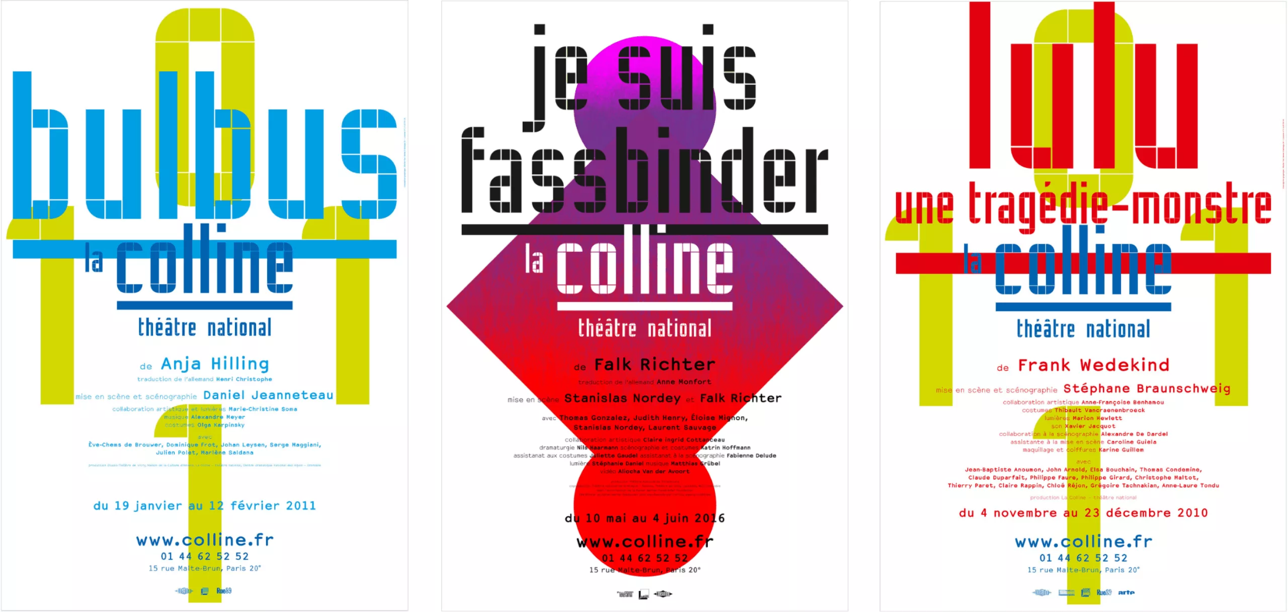 Leur proposition des nouvelles affiches du théâtre la Colline, simple et dynamique, est construite autour d’une typographie des années 1920, trouvée dans un catalogue allemand. Une typo modulaire, carré, quart de cercle et rectangle. Un jeu de construction qui offre à la typographie une place de choix.