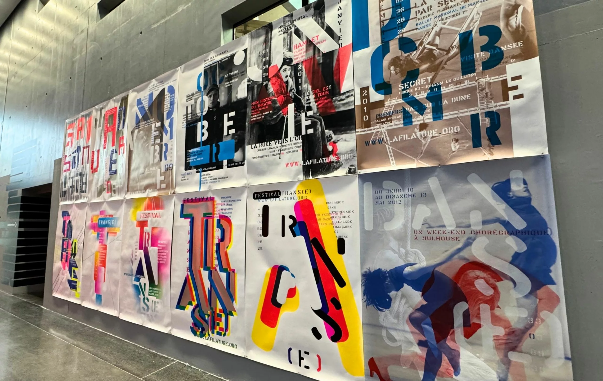 Puis ce sera la Filature, Scène nationale de Mulhouse. Le théâtre est installé dans un ancien bâtiment de filature… Une idée de tissage, métissage, maillage du territoire qui trouvera un écho graphique dans les affiches.