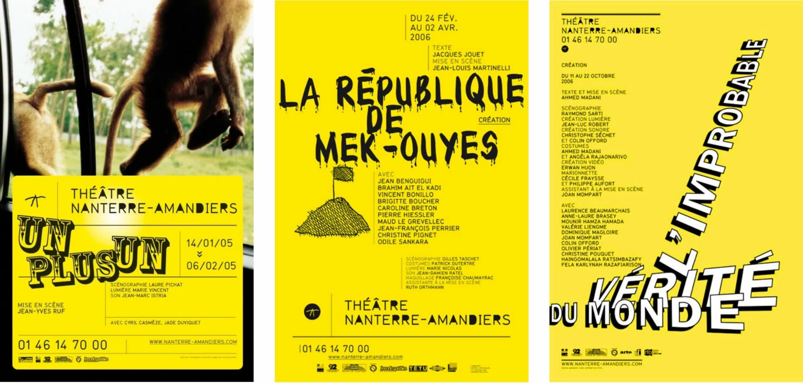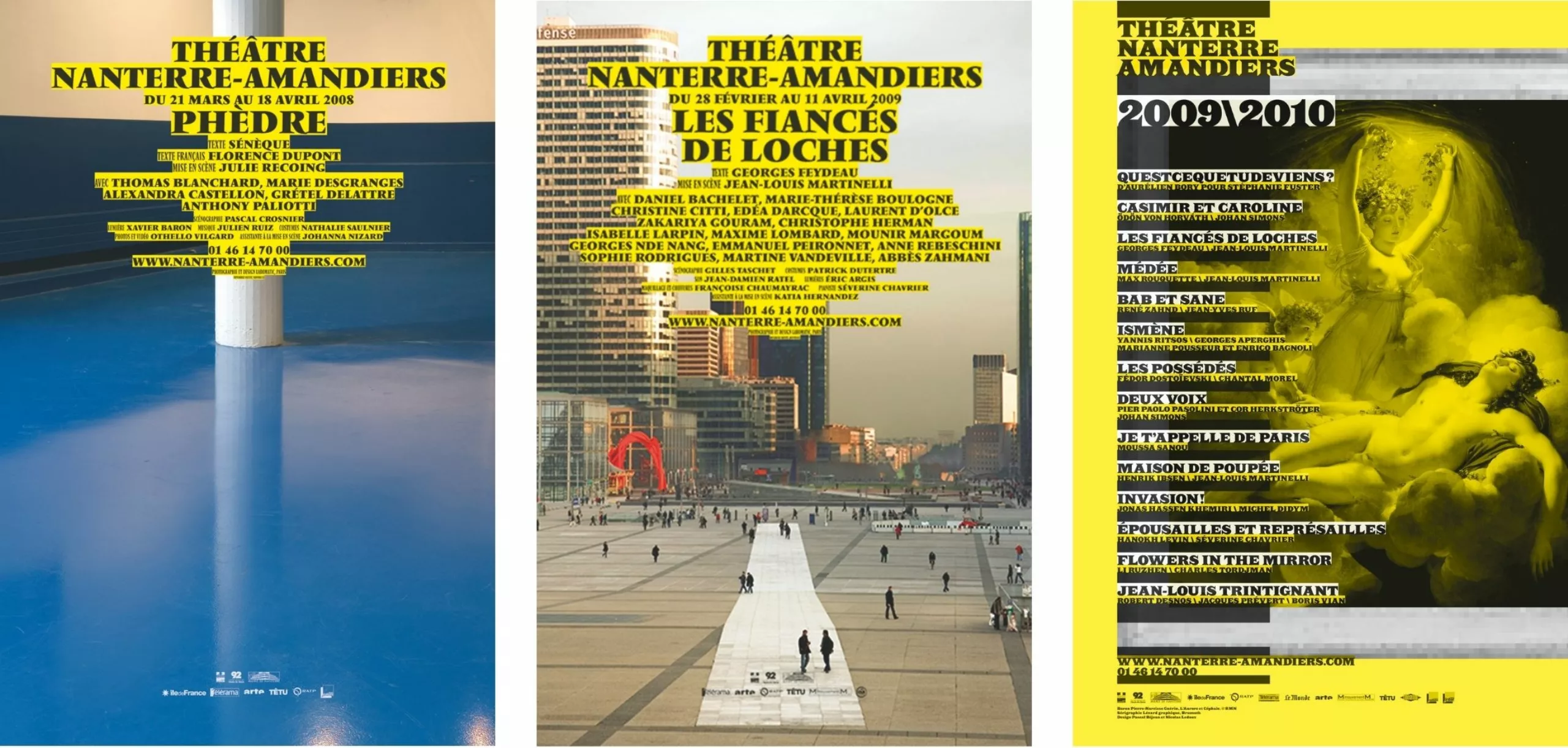 En 2003/2004, la première campagne réalisée par le collectif Labomatic pour le Théâtre Nanterre-Amandiers est d’emblée vécue comme une volonté clairement affichée de faire sortir le théâtre de l’univers visuel où il est enfermé depuis bientôt 50 ans. Tout comme pour M/M (Paris), c’est une nouvelle génération qui compte bien prendre ses distances avec les codes graphiques du théâtre de l’après-guerre.