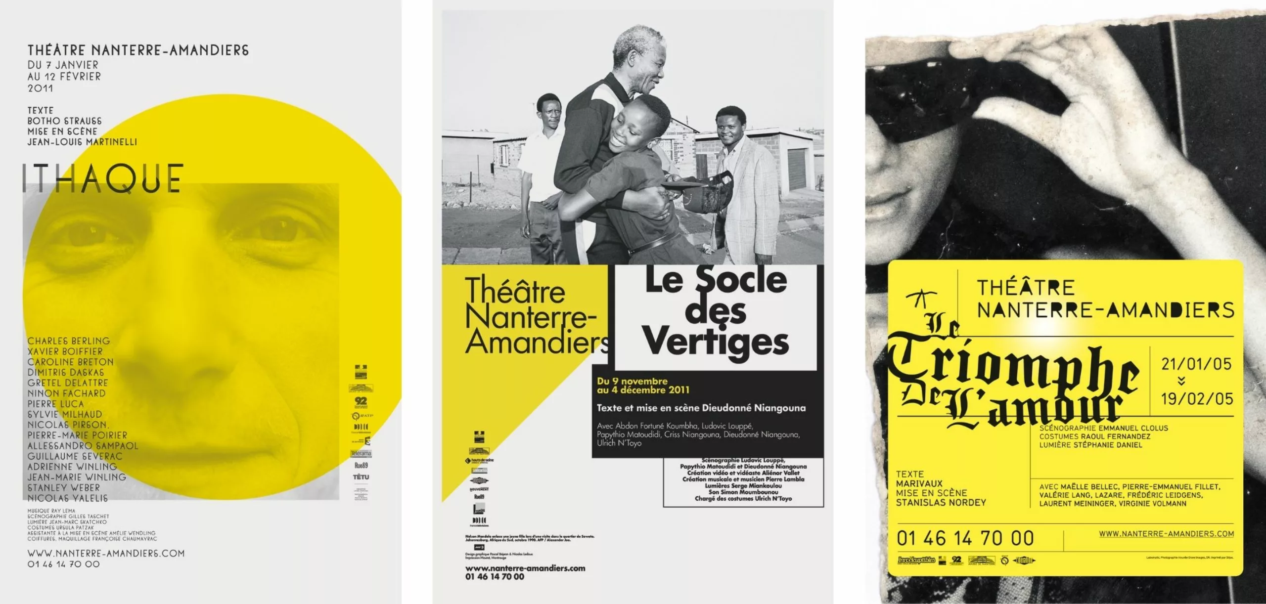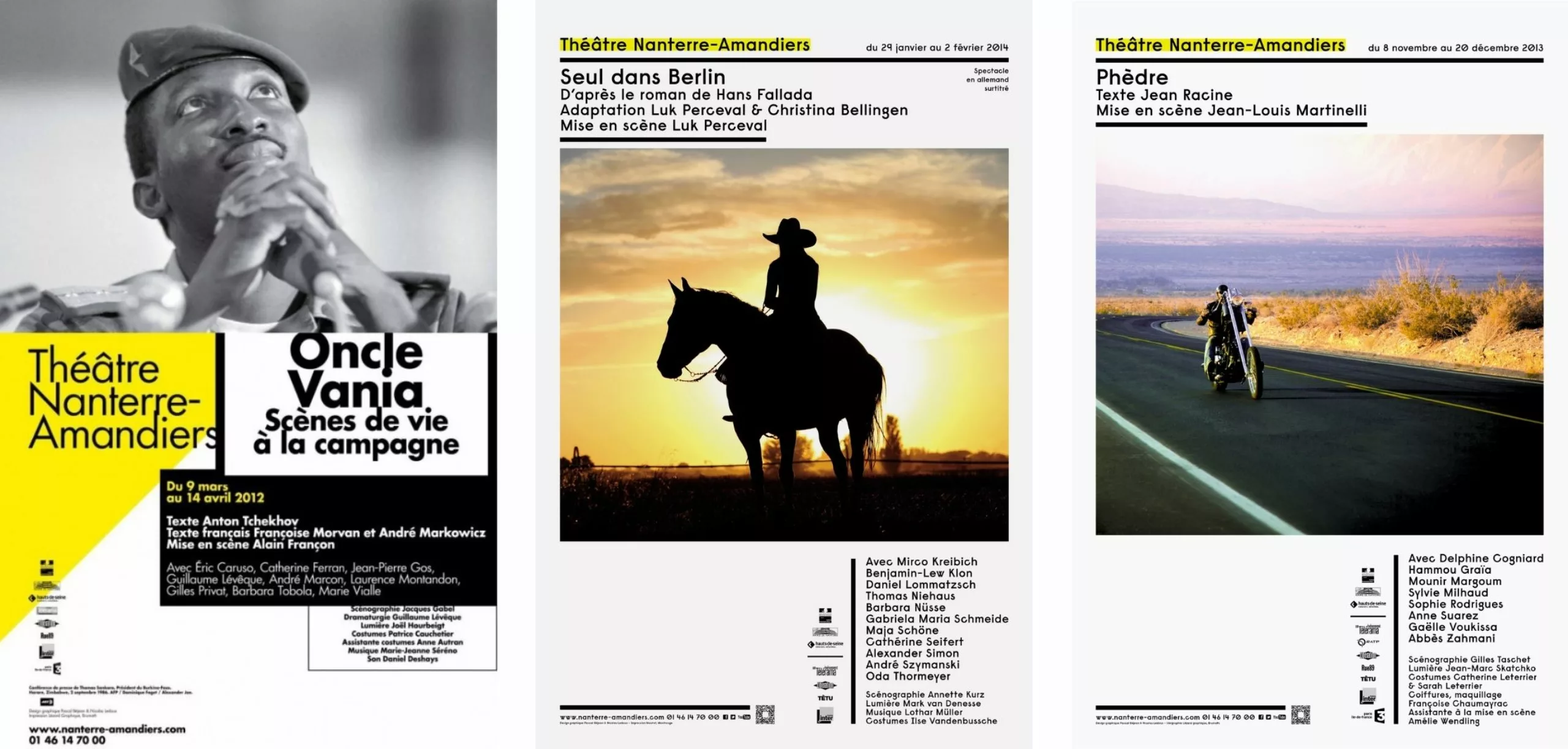 Au cours des années, l’affiche va évoluer et l’image photographique disparaitra progressivement. Puis elle se radicalisera en aplat jaune, typo noir. Comme si Labomatic souhaitait “nettoyer” le regard du spectateur pour redécouvrir la photographie les saisons suivantes. 2007/2008, viendront les images du lieu théâtral, la scène, la salle, les coulisses. Avec toujours le marquage typographique noir sur fond jaune. Avec le Vendôme, un caractère on ne peut plus classique créé sous la direction de Roger Excoffon en 1952. Puis ce sera l’environnement du théâtre, Nanterre, la ville. Puis les tableaux du Louvre en 2009/2010, des archétypes de la peinture classique des 18 et 19e siècles. Sans chercher à illustrer une pièce par une peinture particulière. Des gros plans photographiques en noir et blanc, acteurs, metteurs en scène, auteurs. Le tout sur rond jaune.