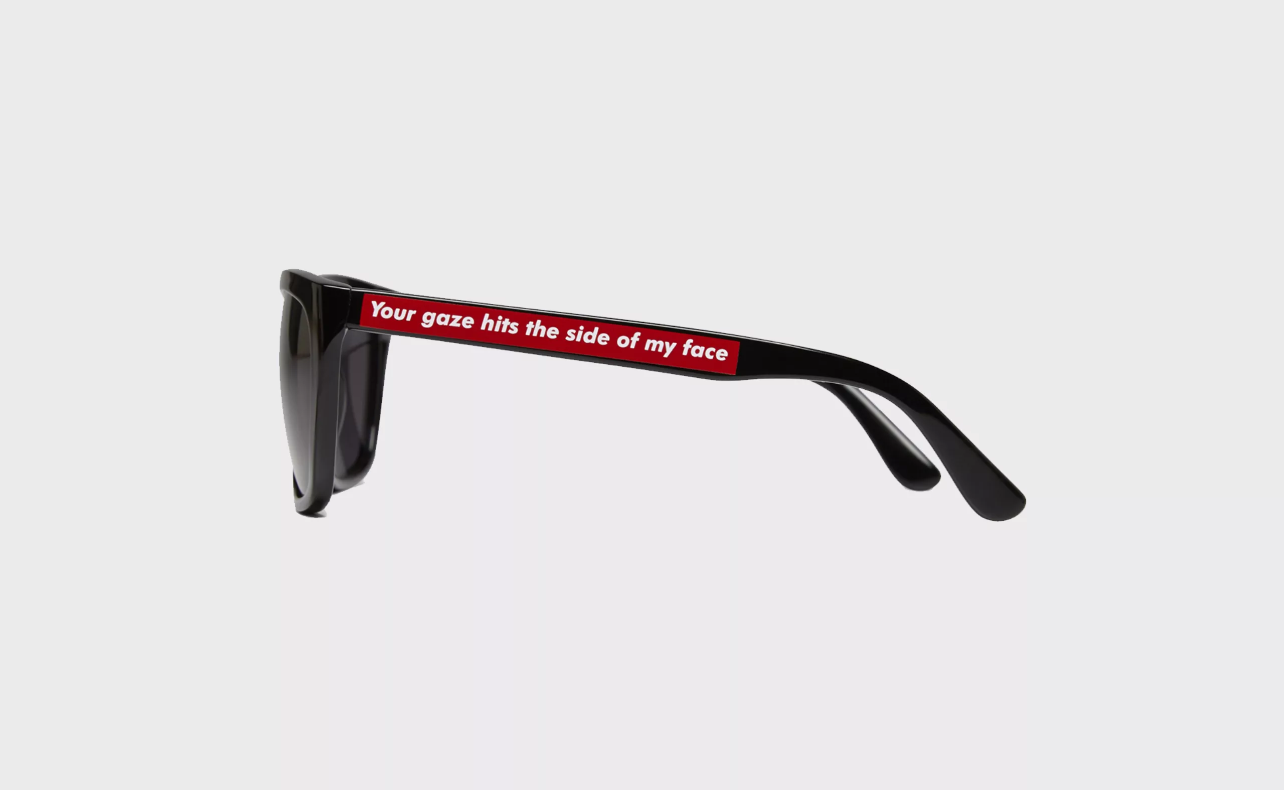 Ci-dessous, Warhol à gauche avec la mention “pas assez beau – pas assez pathétique – pas assez homme – pas assez réel – pas assez cruel” et Marilyn Monroe “pas assez bonne -pas assez maigre – pas assez rien du tout – pas assez ironique – pas assez stupide”. Et la paire de lunettes “ton regard frappe mon profil”, qui invite le regard masculin, le fameux “male gaze” à se remettre en question.
