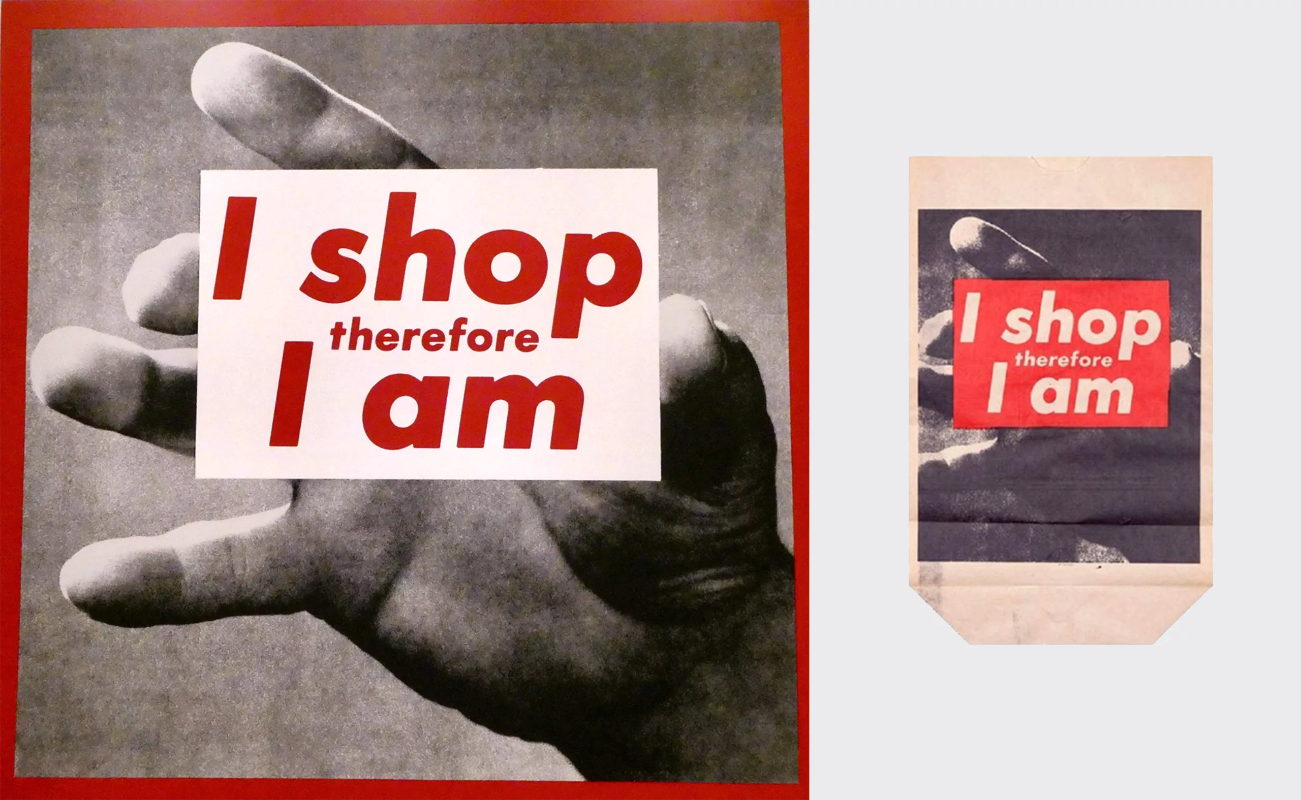 Eh 1987 Barbara Kruger crée l’une de ses œuvres la plus connue, qui demeure extrêmement d’actualité : Untitled (I shop therefore I am). La décennie des années 80 est celle des accès aux crédits à la consommation et aux nouveaux marchés, et le consommateur a de plus en plus de pouvoir. Sur cette oeuvre, une main sans genre précis tient une carte, comme une carte de visite, qui mentionne : I shop therefore I am (je consomme donc je suis), détournant la fameuse pensée de Descartes, “je pense donc je suis”. Elle imprimera aussi cette image sur des sachets en kraft pour faire ses courses.