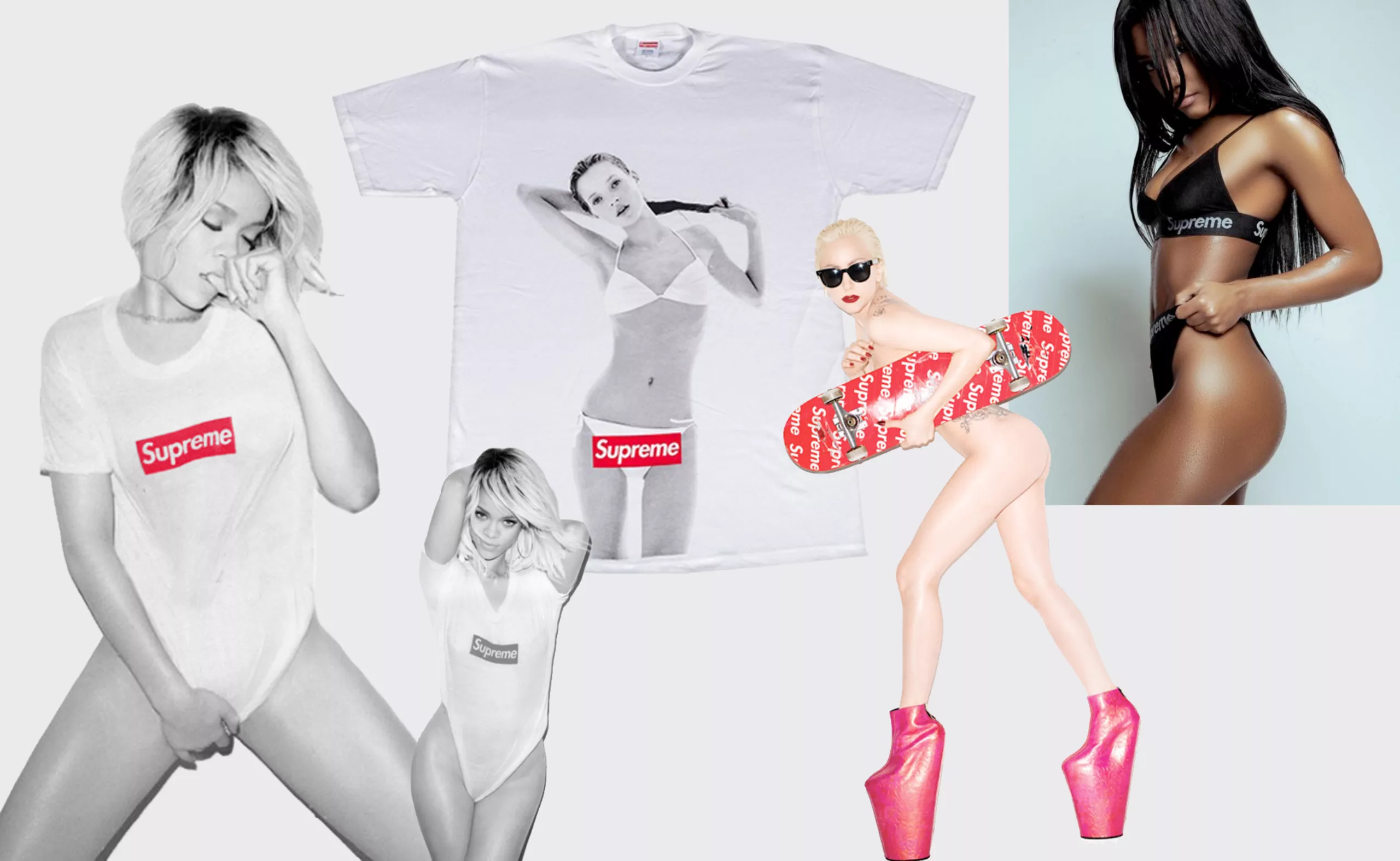 Là où l’artiste Kruger critiquait le capitalisme, le consumérisme et le machisme ambiant, Supreme (la marque la plus cool -selon la génération Y) s’y baigne allègrement. Destinée aux hommes, les rares campagnes de communication représentant des femmes s’en servent pour “censurer” leurs parties intimes avec le bandeau de la marque, invitant ainsi le regard masculin à se poser sur ce corps féminin, une fois de plus champ de bataille et levier de consommation sexiste. Il n’y a aucun second degré chez Supreme : la femme y est clairement prostituée en objet commercial.