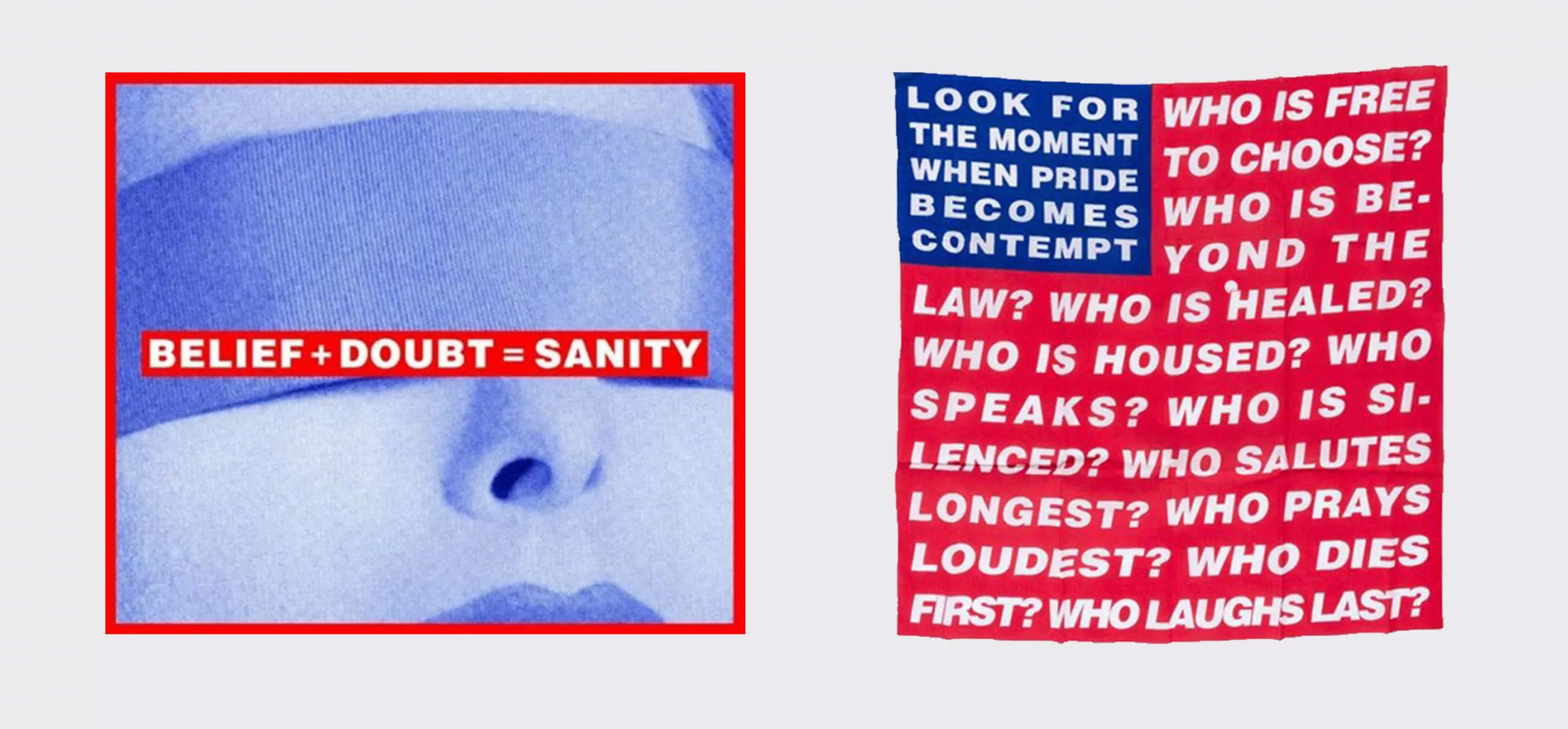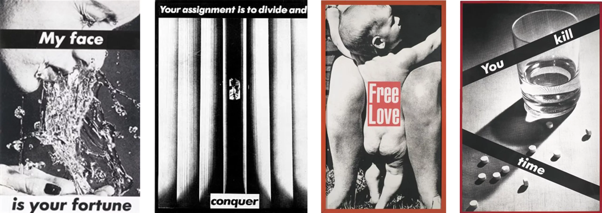Avec son expérience de graphiste et son œil de photographe, elle crée en 1979 ce fameux style graphique qui deviendra iconique : du texte majuscule en Futura Bold ou Helvetica Ultra Condensed sur fond d’images publicitaires des années 50 qu’elle agrandit sur de grandes bannières, avec trois couleurs ; du noir, du rouge et du blanc. Sa première exposition aura lieu la même année au centre d’art contemporain P.S.1 du MoMA (New York). Sur ses photomontages elle glisse de grands messages qui donnent à réfléchir : mon visage est ta fortune, ton rôle est de diviser et conquérir, amour gratuit, tu tues le temps.
