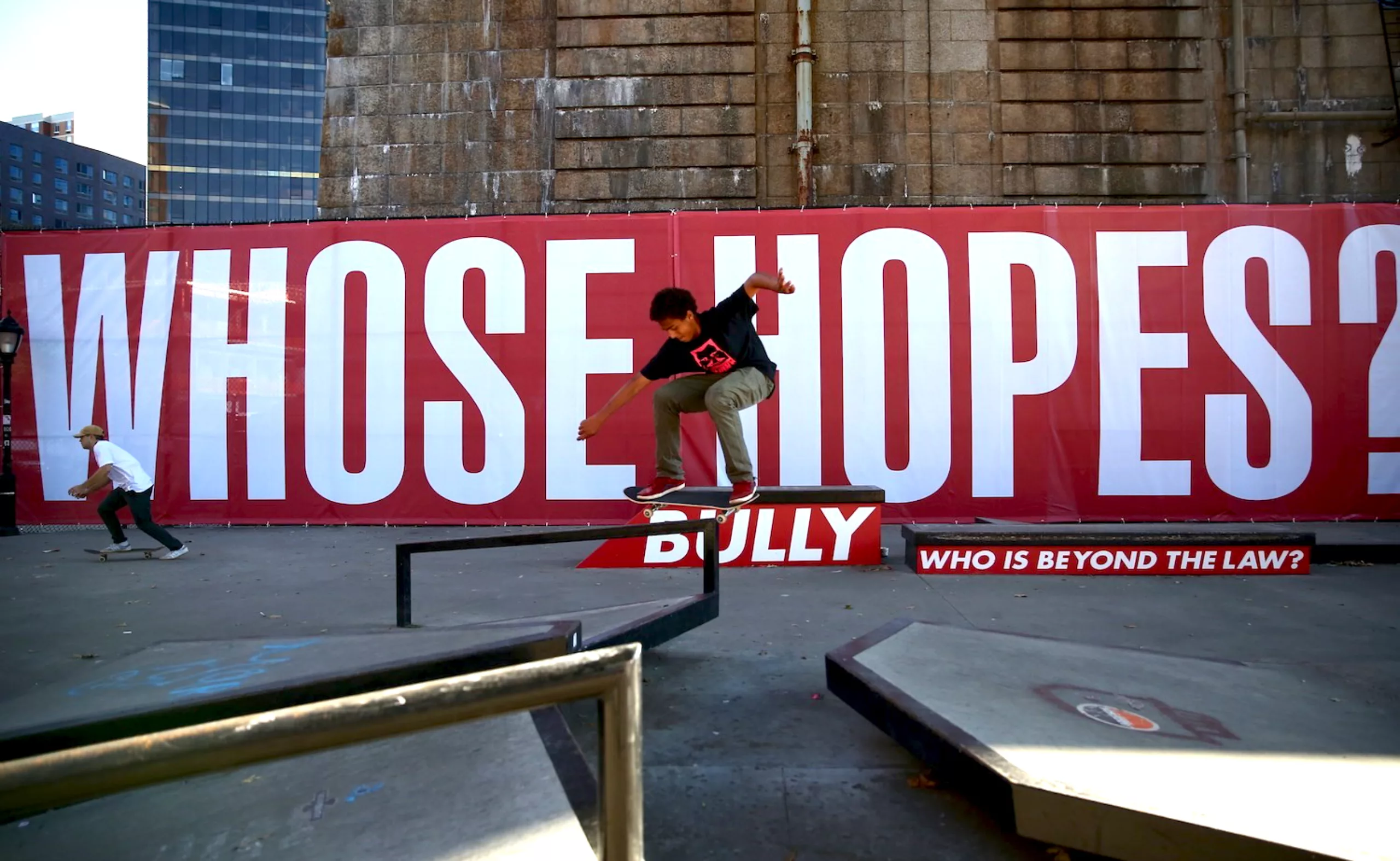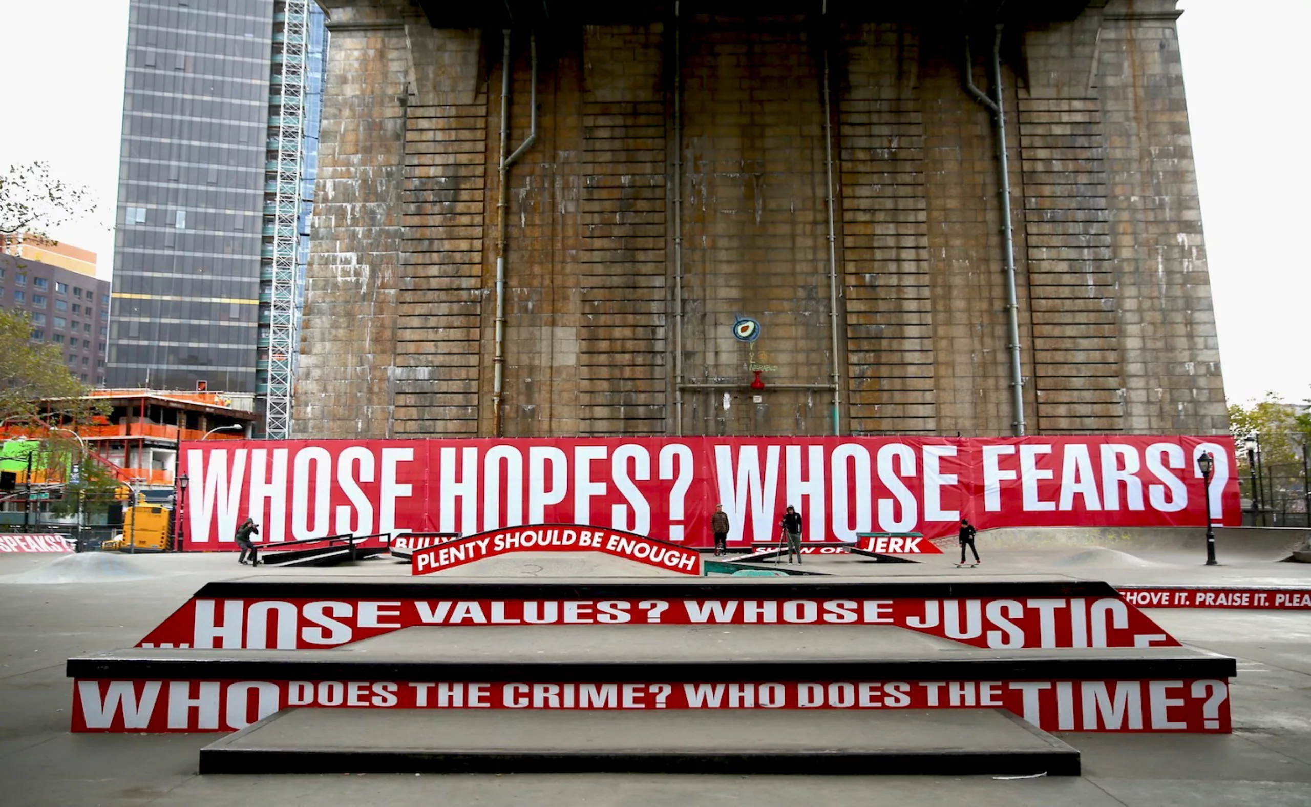En réponse, plus officiellement dans le cadre d’une Biennale d’art en 2017, Barbara Kruger lance une installation dans une galerie-boutique et un skate park à New York, affichant des slogans comme “qui copie qui ?” – “qui appartient à qui ?” – “l’argent parle” – “brute” – “les valeurs de qui ?” – “qui est au-dessus de la loi ?” ou “ne sois pas un crétin”, décliné sur des bannières, des t-shirts (de la marque Volcom) et des planches de skate, évidemment. Les gens payent 5$ pour faire la queue devant ce qui ressemble à s’y méprendre à un magasin Supreme, sans savoir qu’ils se font ironiquement prendre au piège du consommateur-consommé.