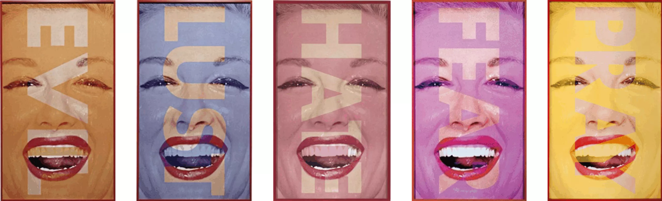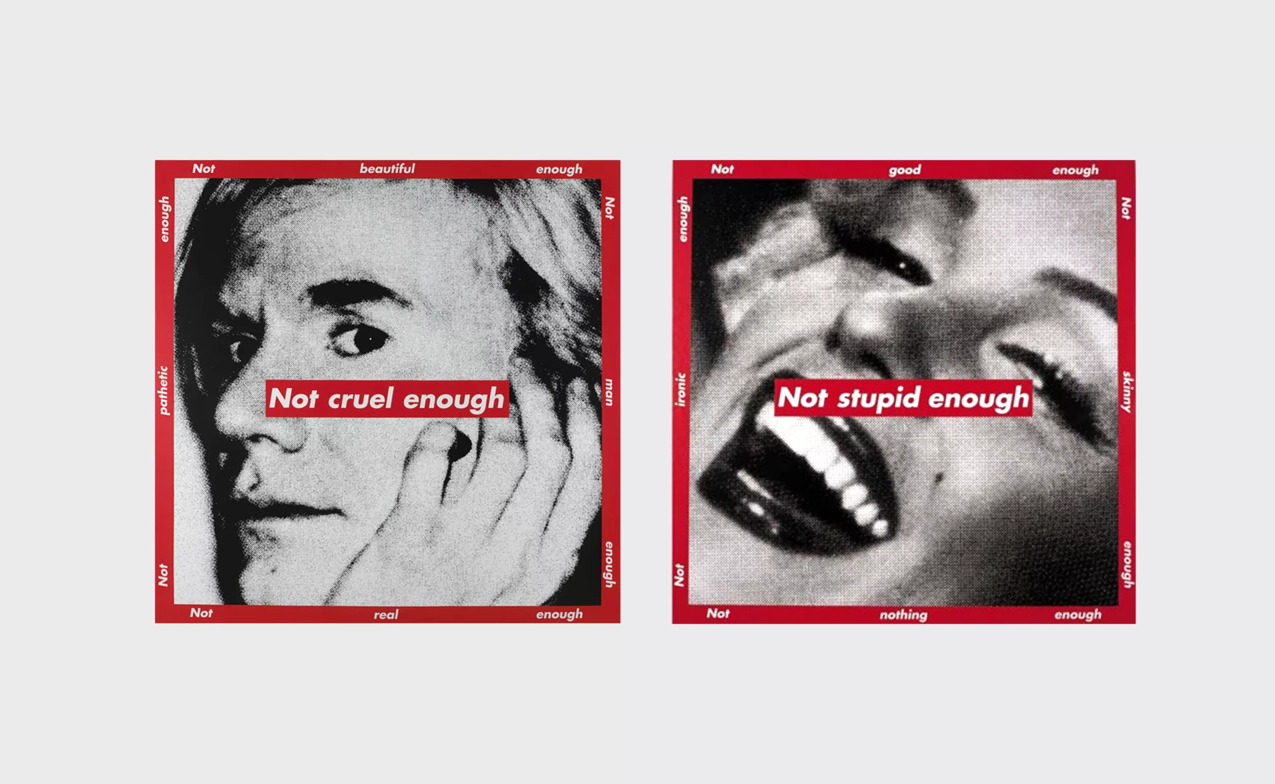 L’usage du pronom “je” ou “tu” permet d’inclure le spectateur (et surtout la spectatrice !) dans ses œuvres, et de l’inviter à se questionner sur ses habitudes ou sa situation. Barbara Kruger dira ironiquement dans une interview de 1991 qu’elle est “intéressée par les images et les mots parce qu’ils ont le pouvoir spécifique de définir qui nous sommes et qui nous ne sommes pas,” et qu’elle a développé “le pouvoir de manier les mots”, parce que c’est “ce que font les filles, à défaut de pouvoir manier les armes”. Elle reprend notamment la phrase de Goethe, “nous sommes les esclaves des objets qui nous entourent” ou décline le visage de Marilyn à la manière de Warhol, en sérigraphiant des mots impactants, par contraste.