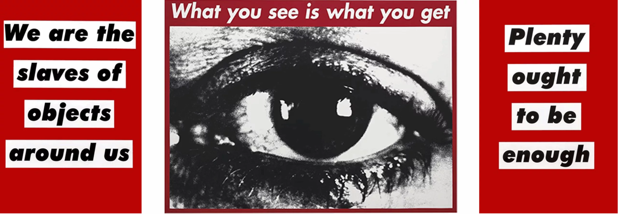 Comme Warhol, l’art de Kruger, reproductible en masse grâce à la sérigraphie ou au digital, questionne l’essence même de l’art et de la propriété intellectuelle. Kruger ne possède en effet ni les droits de l’usage de la typographie Futura, ni le principe de construction artistique texte-rectangle coloré sur photo, qui rappelle plutôt les collages constructivistes. Dès lors, son travail dilue délibérément les frontières entre l’artiste, le spectateur et l’œuvre, qui ne s’affiche plus dans des galeries mais comme un bien de consommation, voire même une publicité, tout en dialoguant avec le consommateur-collectionneur.