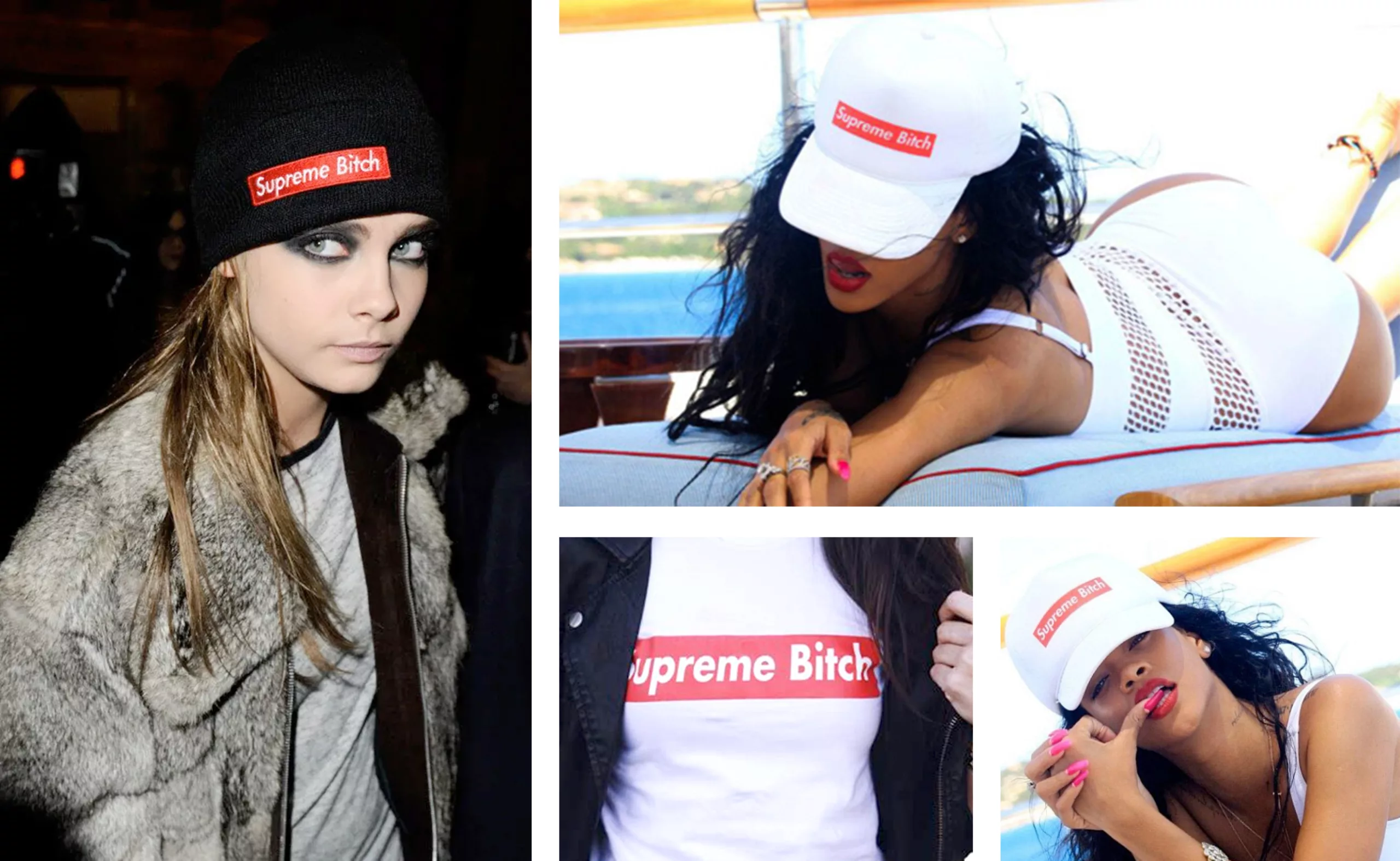 L’image du t-shirt avec Kate Moss (ci-dessus) est d’ailleurs elle-même tirée d’une publicité de Calvin Klein que Supreme s’est appropriée… Pour pousser le bouchon un peu plus loin, en 2004 la marque Married to the Mob joue elle aussi le jeu de l’appropriation graphique et lance des t-shirts et casquettes anotées “Supreme Bitch” (Pute Supreme). Le designer a obtenu l’autorisation de son copain Jebbia (fondateur de Supreme). Rihanna, Cara et tout un tas de stars internationales s’empressent de s’en vêtir. Qui est la pute de qui ? Ironie ironique.