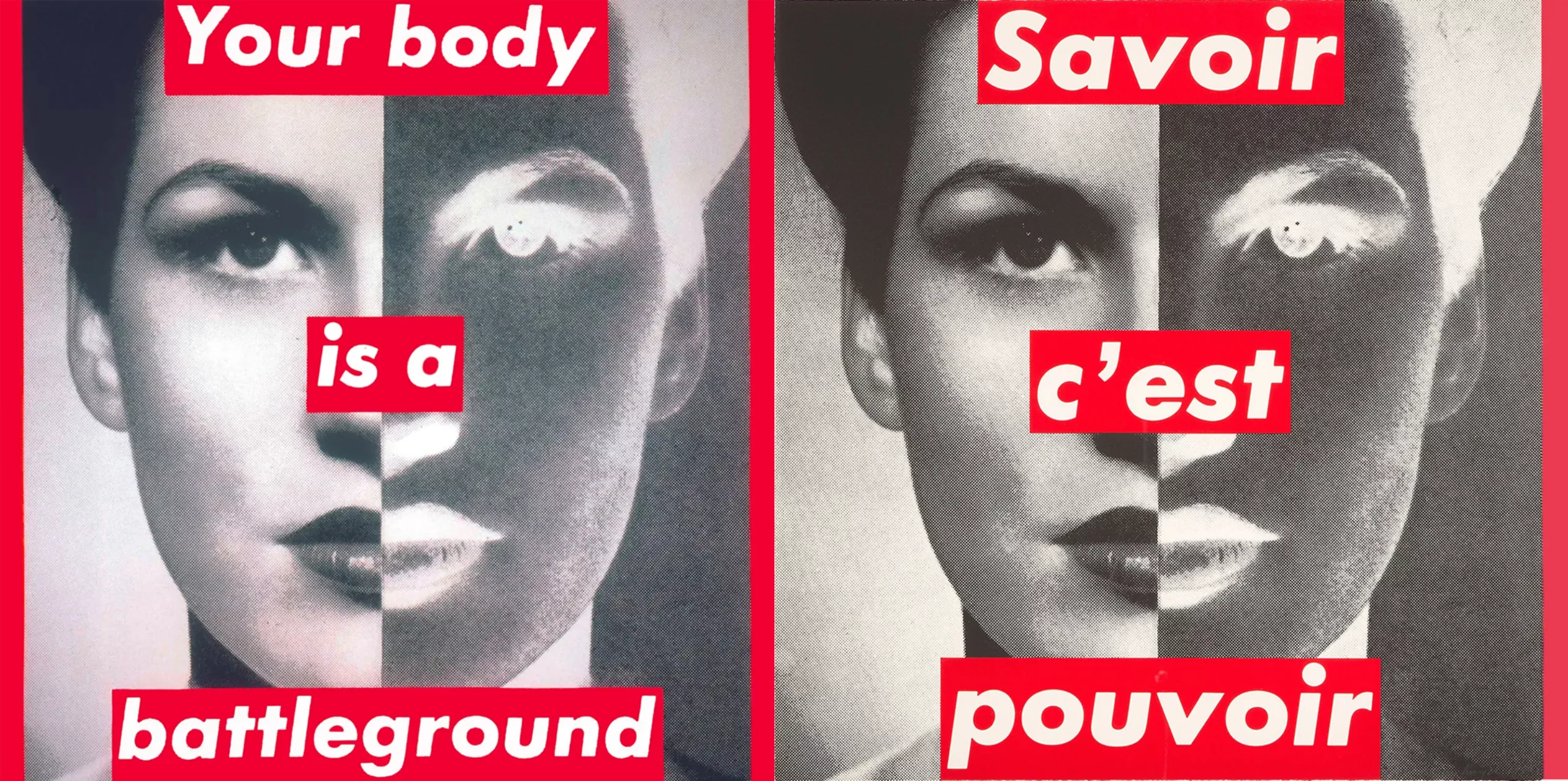 Deux ans plus tard, en soutien pour une marche de libre-choix d’avortement à Washington en 1989, elle crée sa deuxième œuvre la plus marquante : Untitled (your body is a battleground) (sans titre – ton corps est un champ de batailles), alors que des vagues anti-avortement déferlent aux États-Unis. Elle sera déclinée en français (savoir c’est pouvoir), et même en polonais, pour défendre les mêmes causes. Cette affiche sérigraphiée reprend un visage féminin séparé en deux parties égales et traité en négatif. Tiré d’une affiche publicitaire, probablement d’une publicité de cosmétiques, ce visage dénonce d’abord l’usage du corps de la femme comme produit stéréotypé issu de la société, et dicté par ses lois. La femme ne s’appartient plus à elle-même.