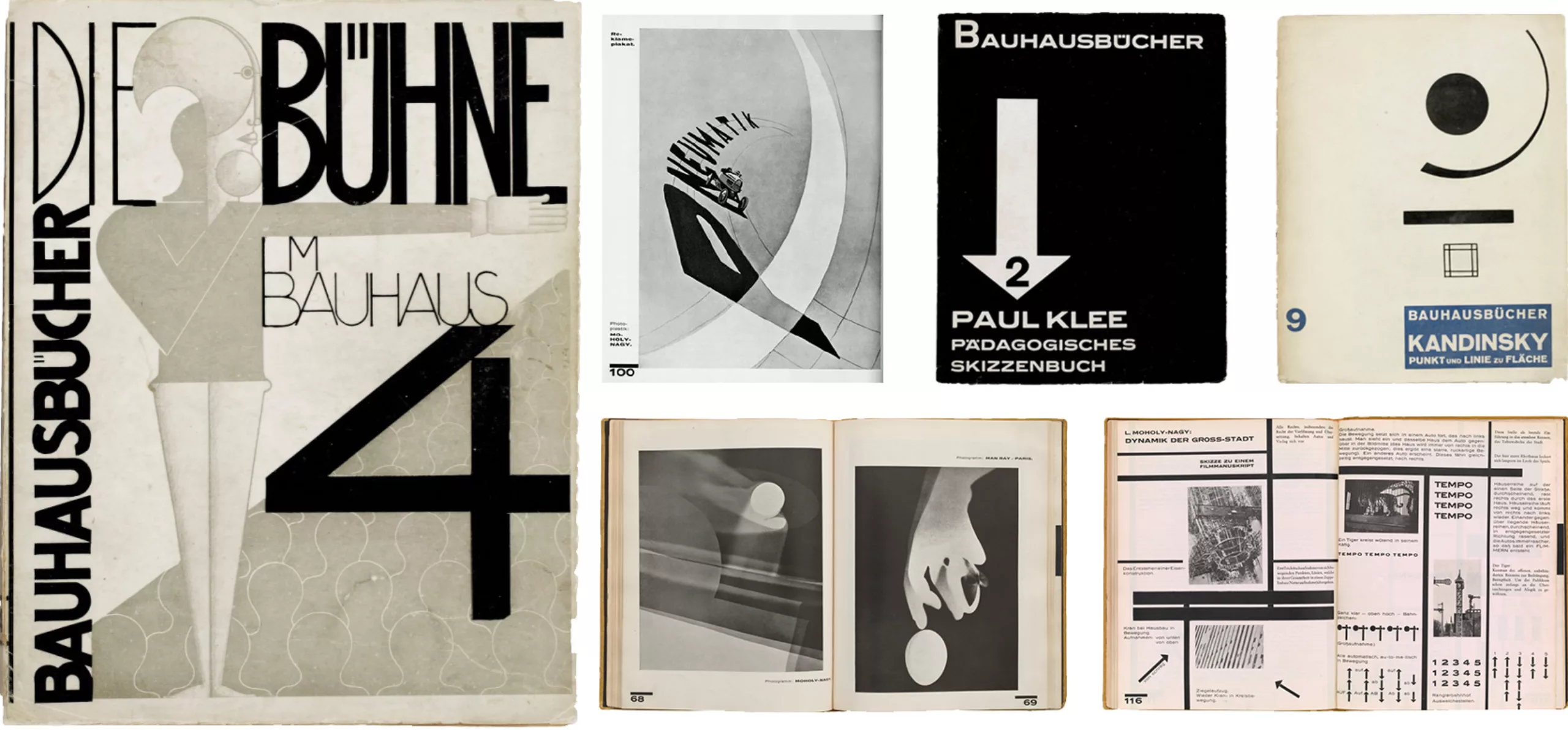 Moholy-Nagy fait partie de ces artistes insatiables et sans cesse en recherche de nouveaux médium et styles. Avec Gropius, il s’attèle à publier les livres du Bauhaus, dont les carnets de cours de Klee. Après son expérience au sein de l’école, il crée son propre studio de typographie, scénographie d’expositions, photomontage et photo collage. En 1937 il devient directeur de la nouvelle école de design du Bauhaus à Chicago et fait rayonner le Bauhaus aux États-Unis.