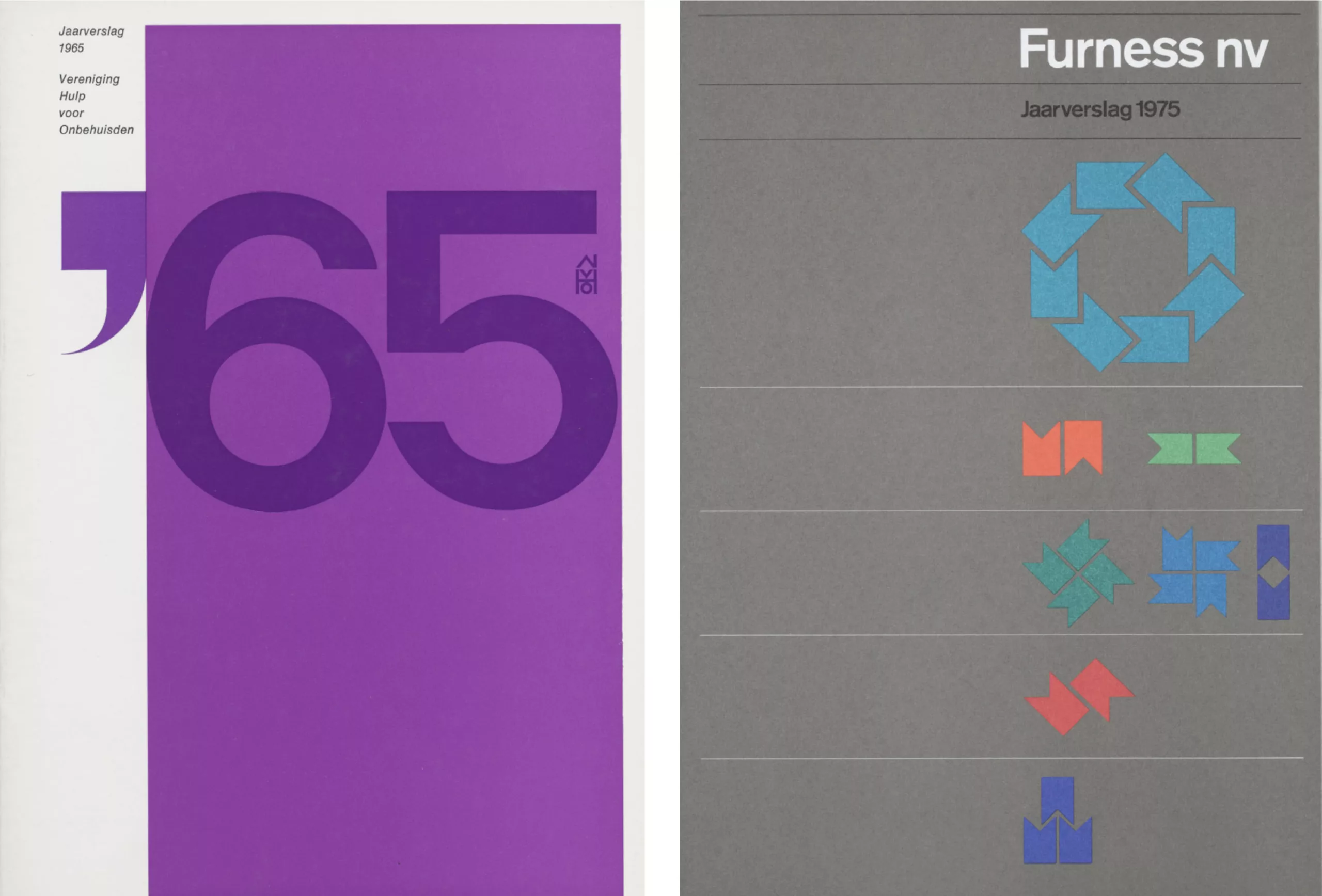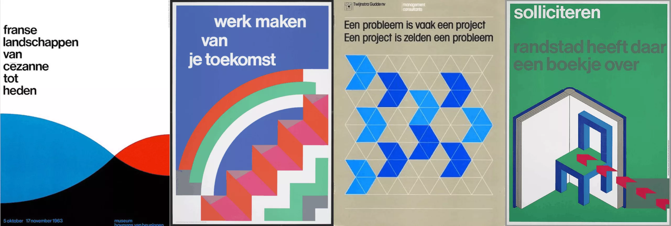 Dans la majorité de ses travaux, on retrouve un univers colorimétrique riche et pétillant, de grands aplats de couleurs, des formes géométriques… On pourrait y voir quelque chose de presque enfantin, une sensibilité de jeune garçon presque palpable. À l’instar de l’identité qu’il a imaginé pour la municipalité de Dronten en 1975, qui est encore utilisée aujourd’hui.