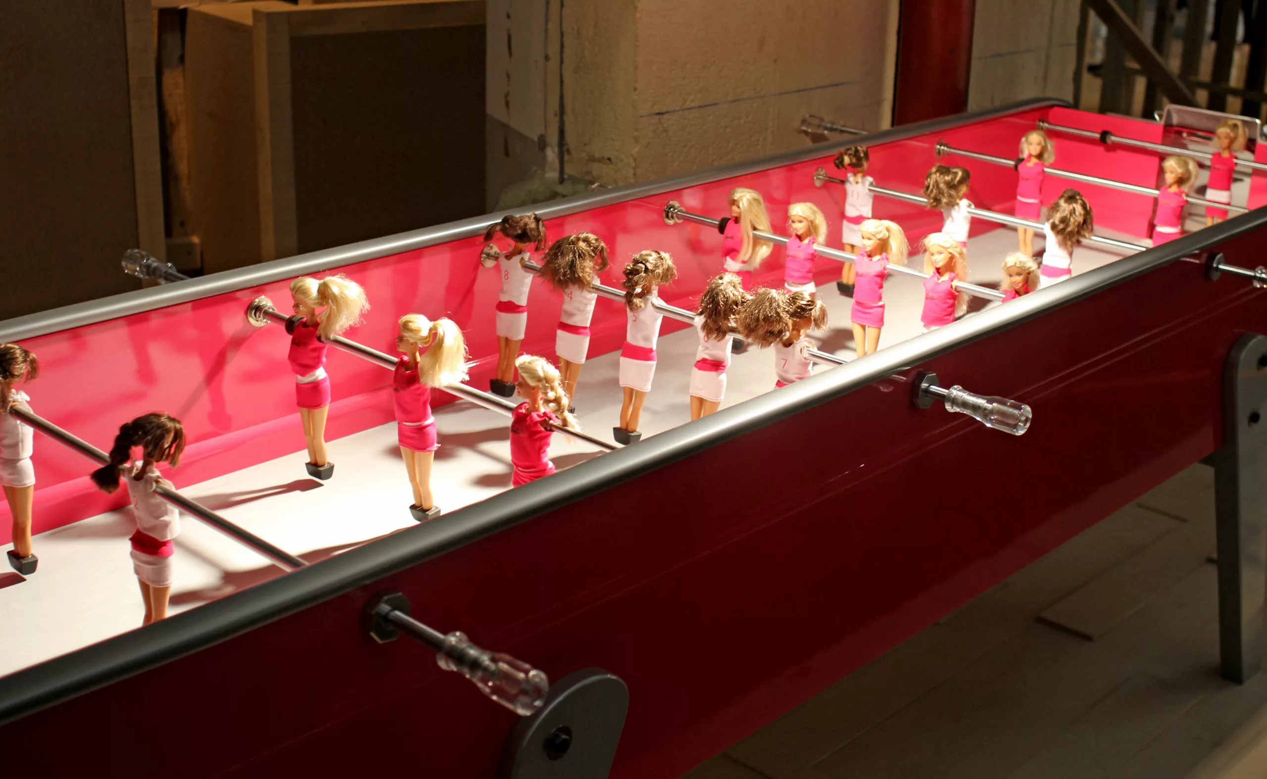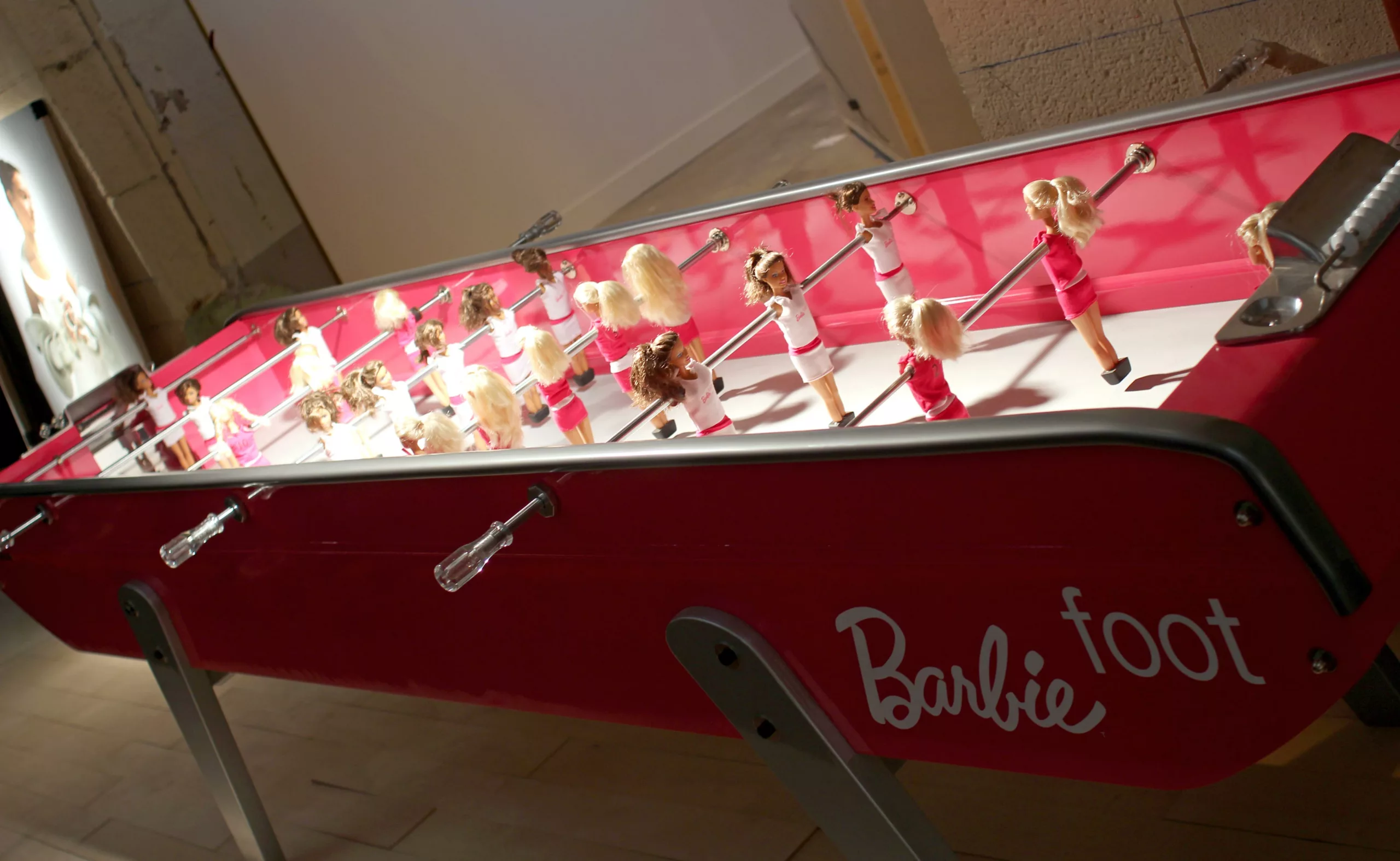 Le Barbie Foot est un baby-foot, dans lequel les figurines des joueurs de foot ont été remplacés par des Barbies footballeuses.Cet objet réunit en un même objet deux univers que tout opposent. D’un côté le monde tout rose de Barbie, jeu de petite fille mais aussi tout l’univers de la séduction et de l’ultra féminité, de l’autre le monde viril du sport. Derrière ce jeu de mot, il y a un objet qui porte à réflexion sur nos mentalités et sur les codes de notre société. ( http://www.chloeruchon.com/barbie-foot )