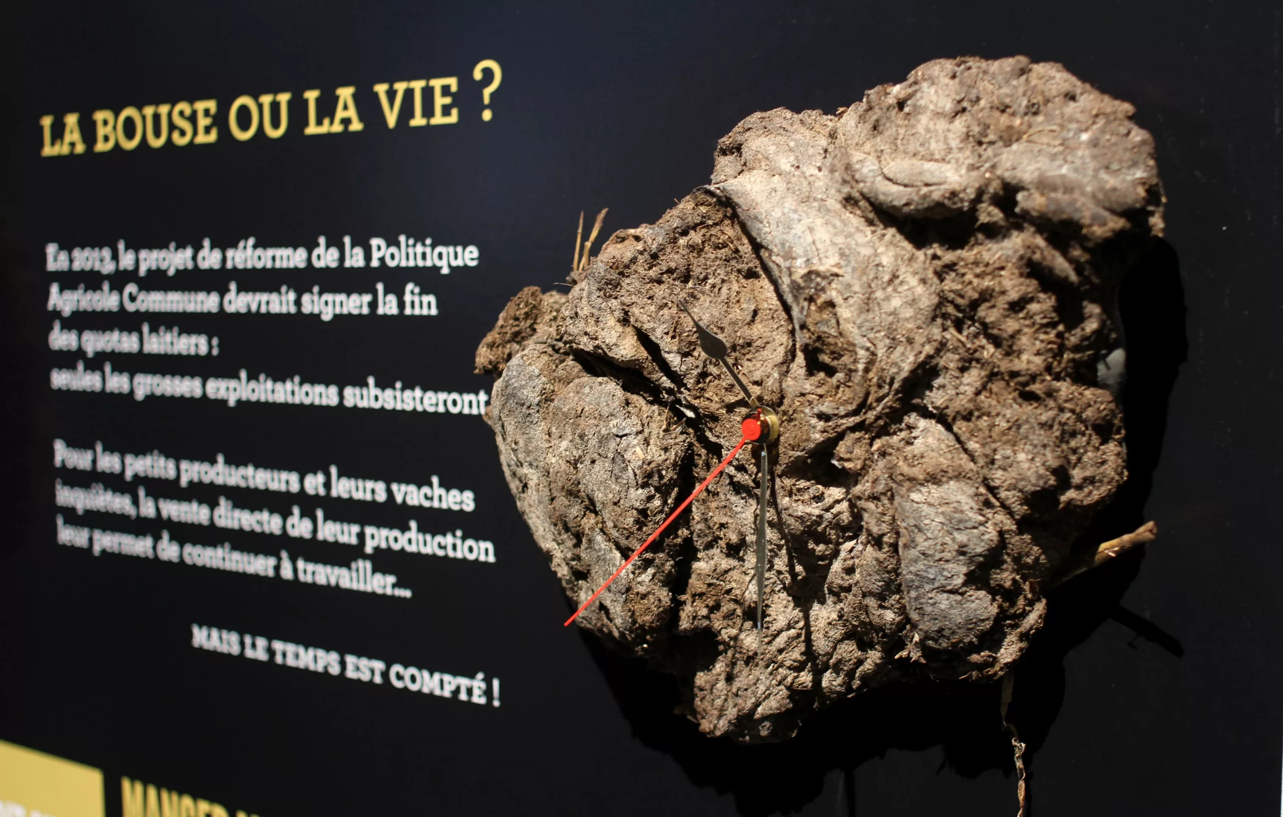 La bouse ou la vie : Horloge-bouse concoctée par le designer Guilhem Chéron, fondateur de La Ruche qui dit Oui ! Un projet satirique qui dénonce la réforme de la Politique Agricole Commune… parce qu’il n’y a pas une seconde à perdre !