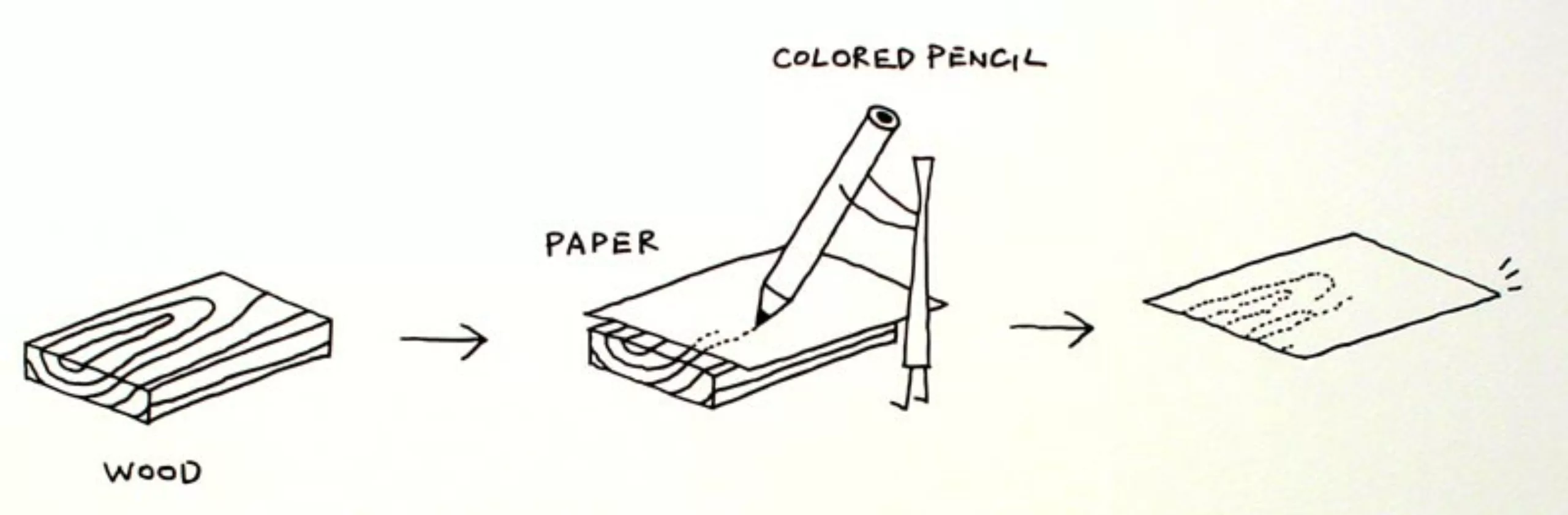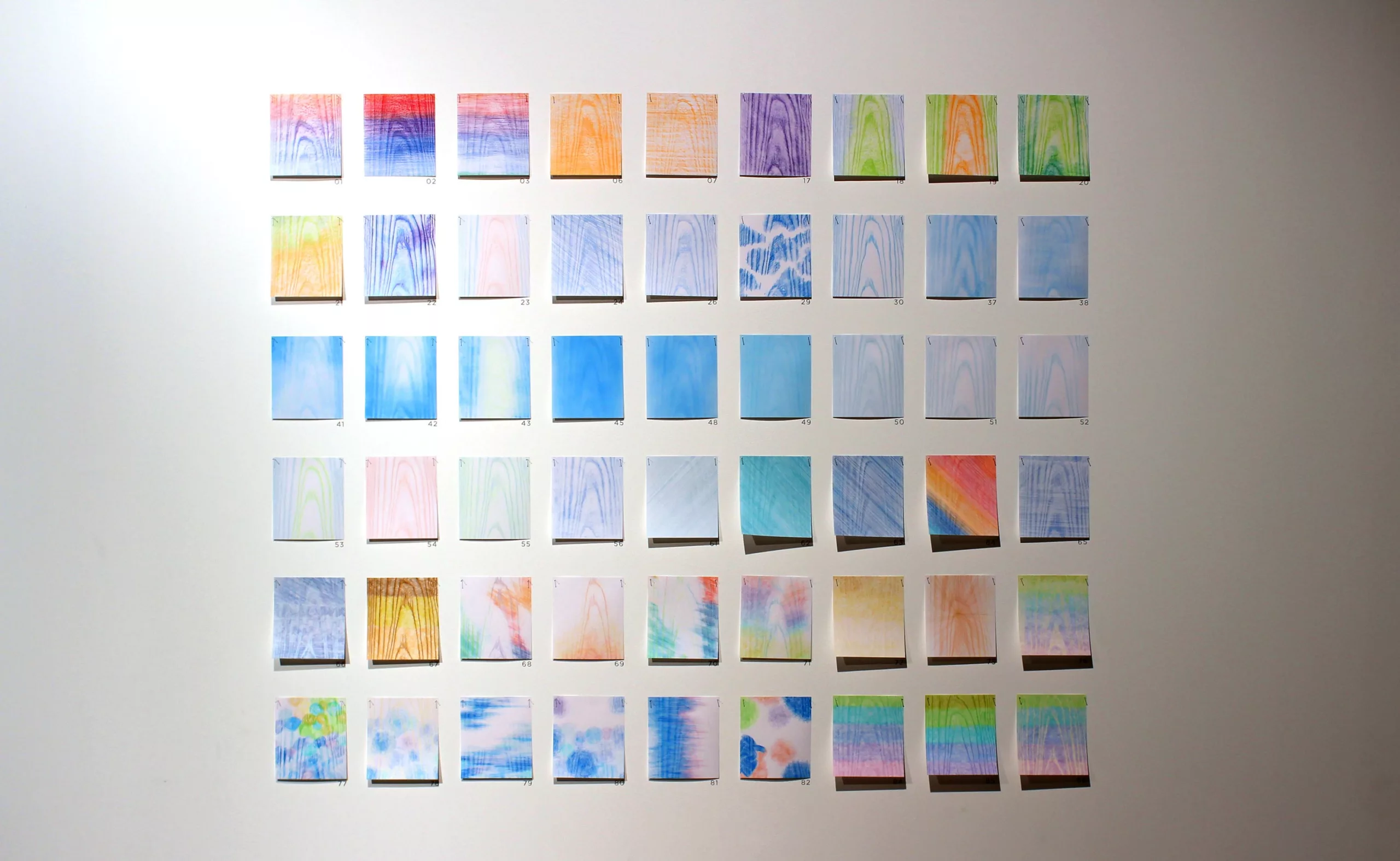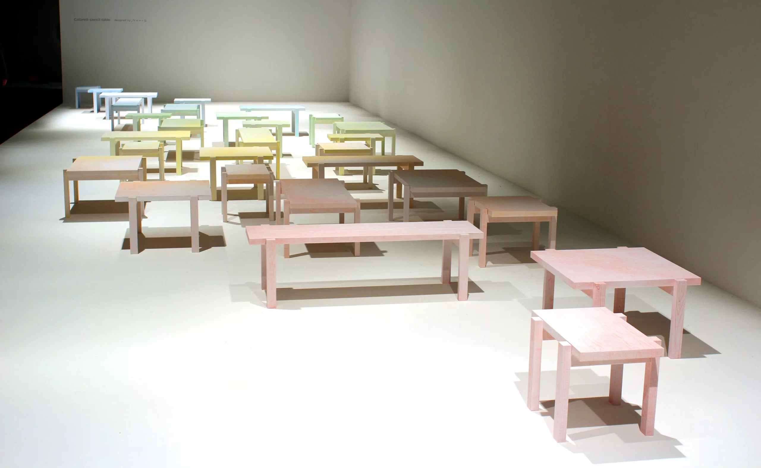 Dans le cadre d’une carte blanche, le studio japonais Nendo propose un projet proche d’une installation d’art contemporain. Il comporte une trentaine de tables disposées selon un dégradé de couleurs, en diagonale dans l’espace d’exposition. Ces meubles sont réalisés à l’aide d’une technique appelée “udukuri”, qui consiste à creuser les plateaux en cyprès des tables pour faire ressortir le grain du bois. Puis le relief des plateaux est transféré au crayon sur le papier qui les couvre. Cela crée une surprenante juxtaposition entre la couleur des crayons et le grain du bois qui est mis en valeur. C’est, selon Nendo, un aperçu du mobilier de l’avenir à travers la manipulation d’une texture de surface.