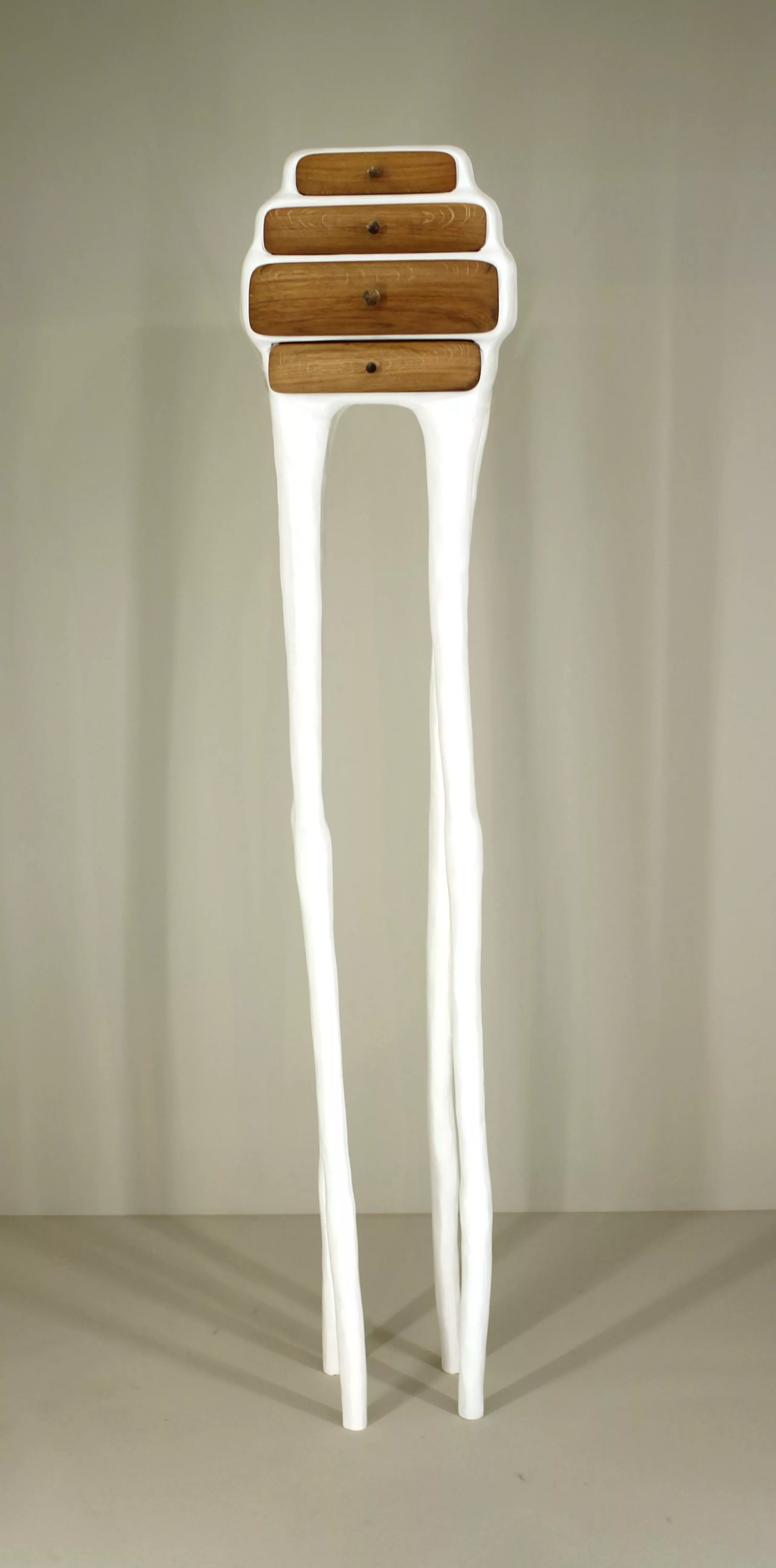 Fluidité des lignes et spontanéité des formes le jeune designer allemand Valentin Loellmann crée des meubles comme autant d’organismes vivants. Les pièces sont faites à la main à partir d’un bois ancien de bankirai renforcé d’une peau de polyester.