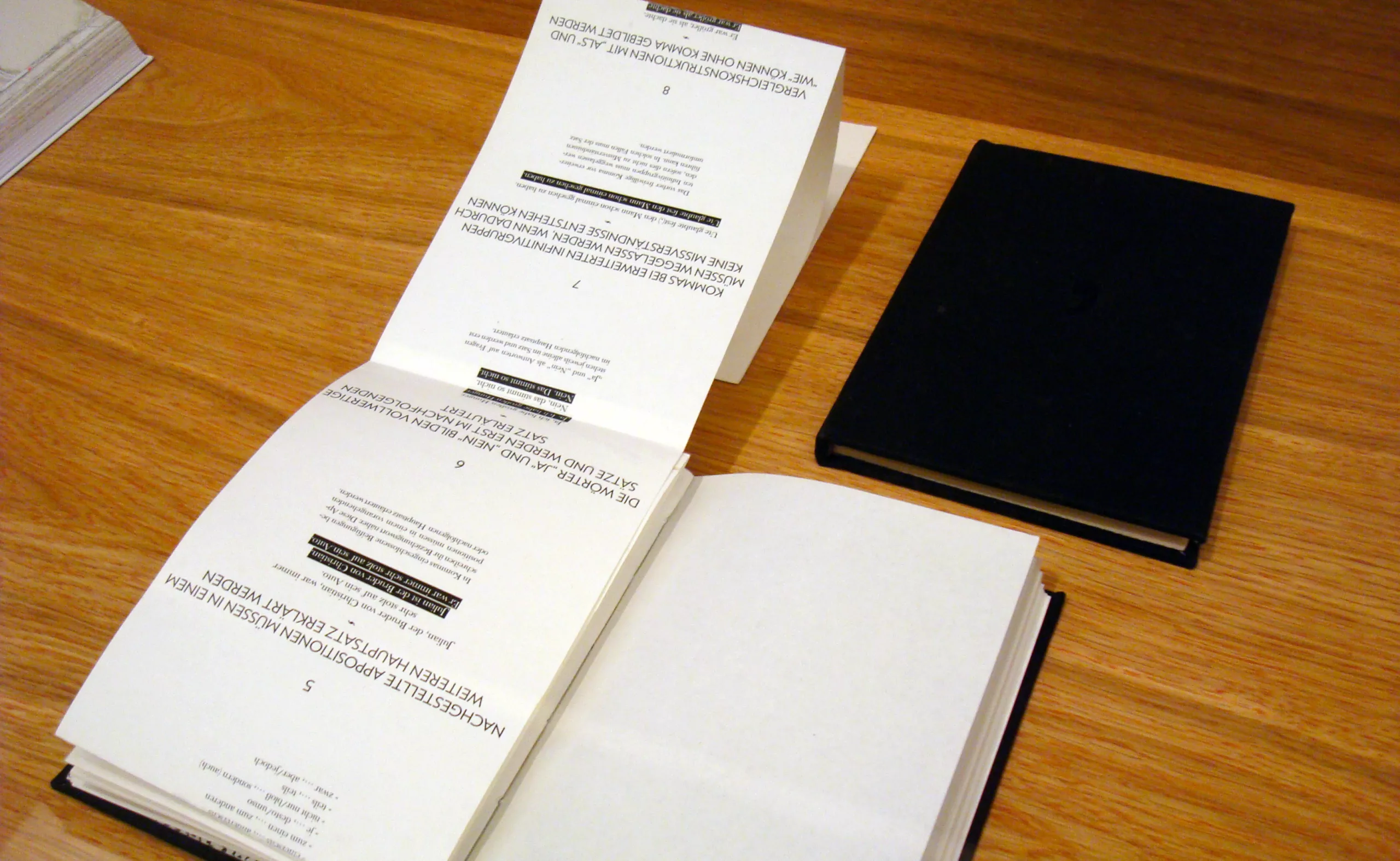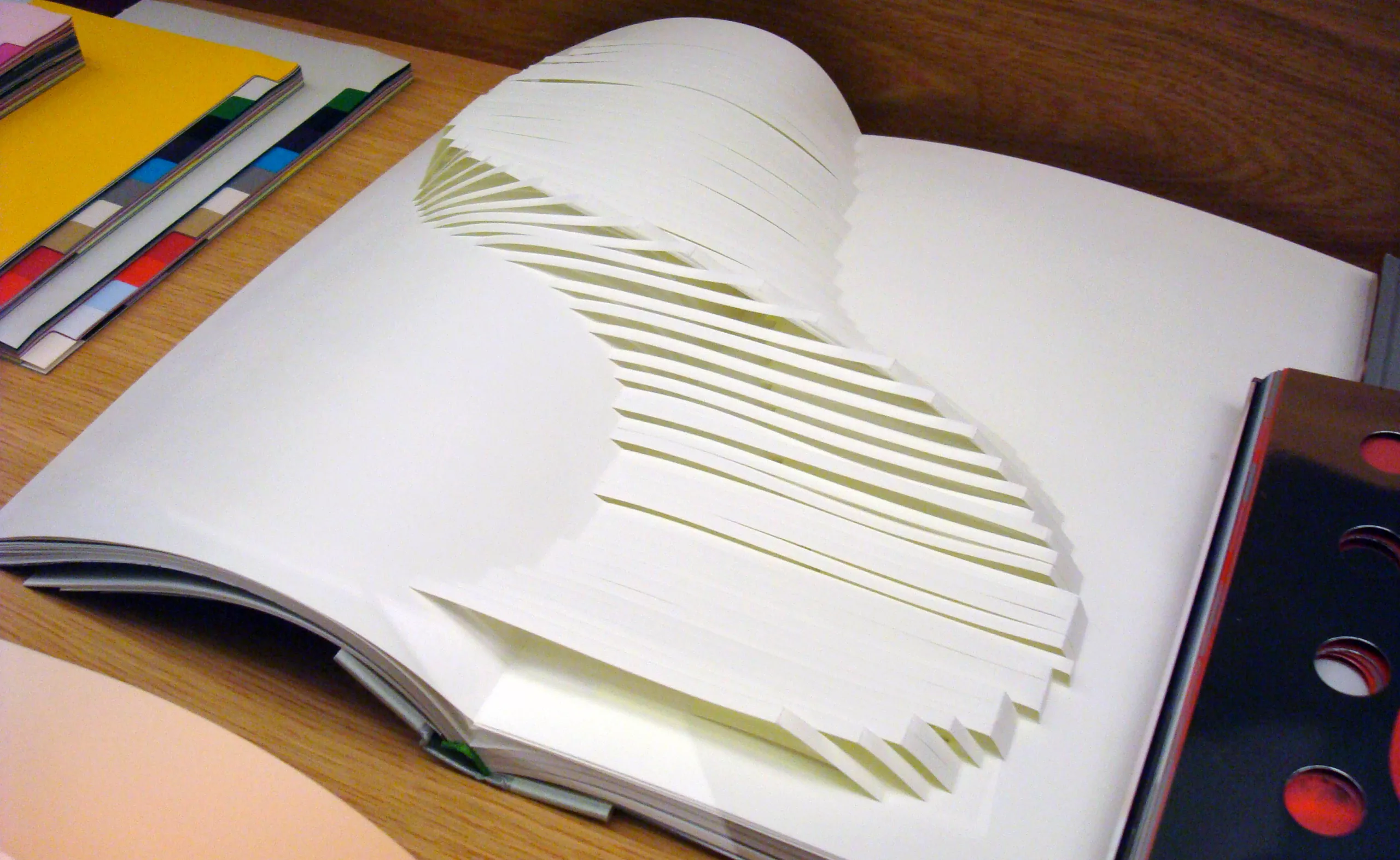 Parmi les ouvrages présentés, certains se focalisent sur la présentation de l’objet, sur la couverture, avec des choix d’impression particuliers (sérigraphie, vernis sélectif, absence de massicotage), un livre niché dans un autre plus gros, une couverture-objet, ou encore une reliure apparente… D’autres s’attardent davantage sur la mise en page, avec l’insertion d’intercalaires, de photos argentiques volantes, l’utilisation des techniques de pop-up, d’encarts qui se déplient, de la découpe laser, de perforations … Cette exposition offre un panorama des possibilités de l’imprimé.