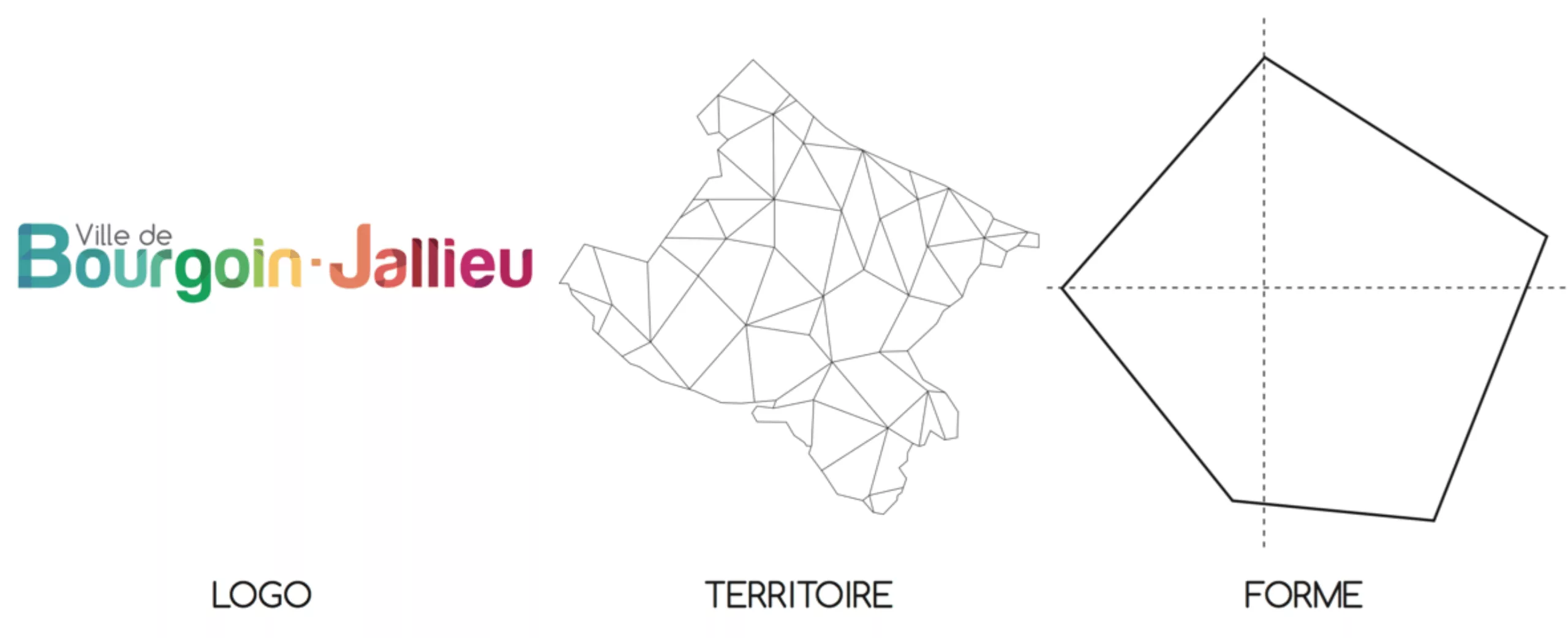 “La réflexion s’est posée à la fois sur la représentation géographique du territoire de la ville de Bourgoin-Jallieu et sur les facettes utilisées dans le nouveau logo. Elle a permis de dégager une forme (facette) qui sera l’interprétation de la ville et qui permettra de renforcer l’identité de Bourgoin-Jallieu en plus du nouveau logo.”
