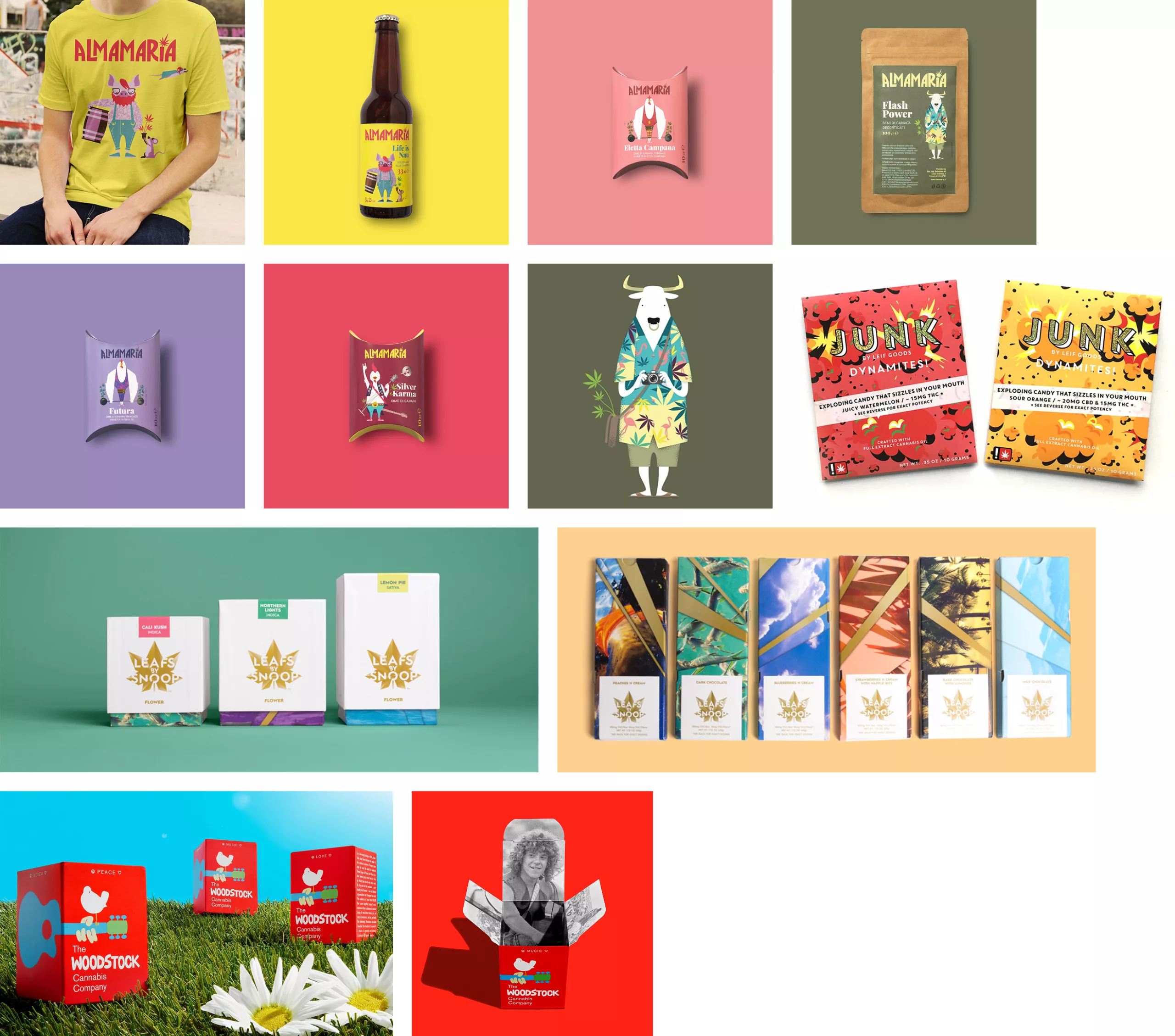 Pour les gens cool. Des produits à l’image jeune, avec couleurs vives, illustrations, photos décalée, symboles… pour s’amuser avant tout, sans compter. Ces produits s’inscrivent dans l’héritage du mouvement peace & love des années 60 (comme l’herbe de la marque Woodstock qui reprend les codes du poster du festival de l’époque) tout en s’adaptant à notre époque. La marque Leafs by Snoop (Dogg) utilise des images planantes et des packagings sobres, pour vivre une expérience “d’élévation” et inviter au voyage “in the air”. Un voyage pas franchement low cost puisque Snoop a fait appel à l’agence Pentagram pour brander sa marque. (D’ailleurs, l’agence semble bien s’imprégner du produit car elle a également réalisé le packaging de l’herbe Woodstock, et de Harmony Extract). Les italiens d’Almamaria ont fait appel à l’illustrateur Mateo Manenti pour concevoir leurs packagings animaliers et décalés.