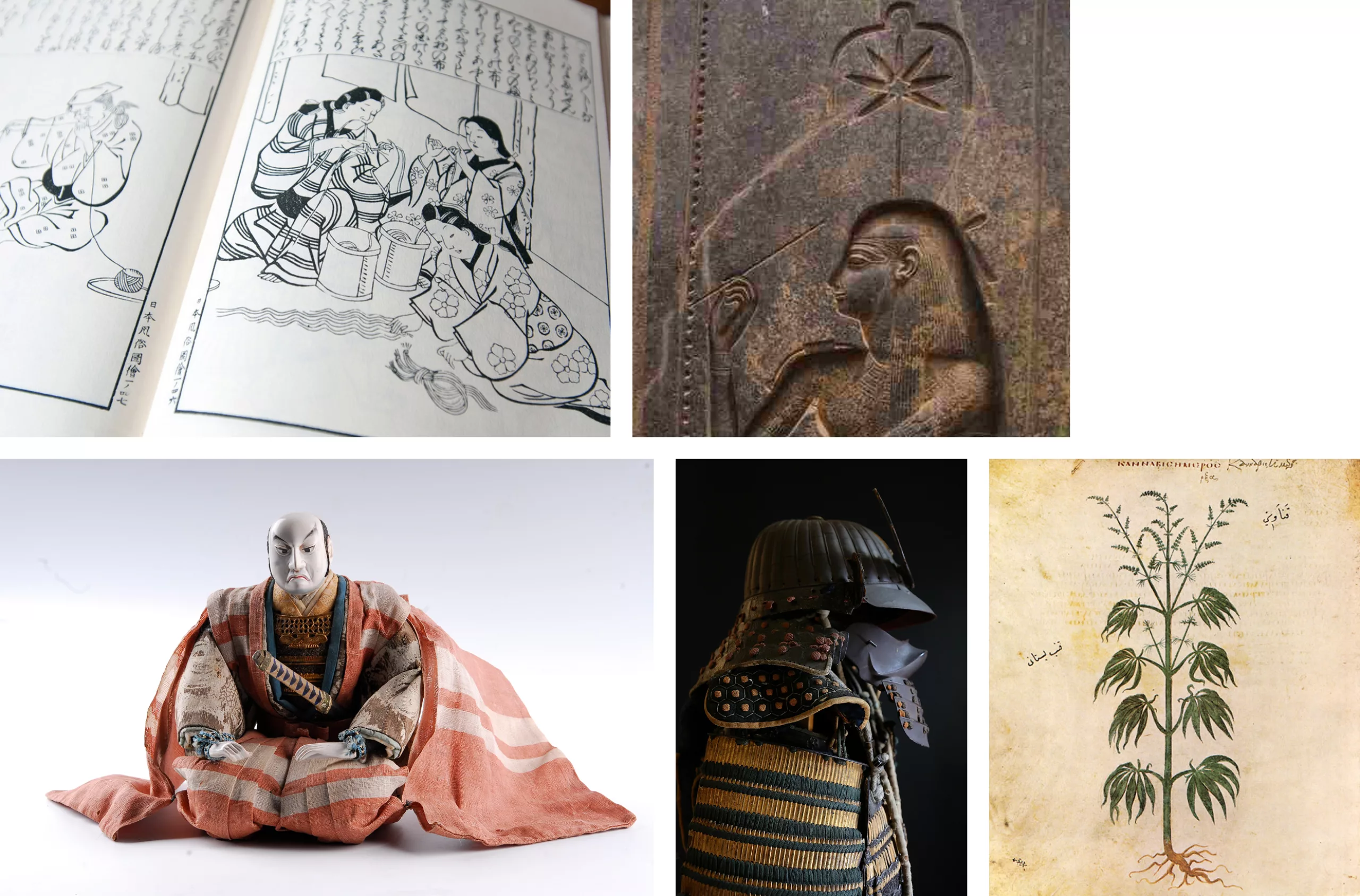 Au Japon, le chanvre était également un matériau de luxe, et les samouraïs utilisaient sa fibre tissée pour s’en faire des vêtements imperméables, trempés dans du jus de kaki (cf images ci-dessus). Au XIVe siècle, les daimyos, seigneurs de guerre, encourageaient leurs vassaux à cultiver du chanvre (cf cette estampe du 17e siècle, photo Hiroko Tanaka et Junichi Takayasu), et les empereurs s’en drapaient. Après la seconde guerre en 1948, sous l’influence des États-Unis et de leurs lobbys anti-drogue, le Japon vote une loi pénalisant la possession de cannabis.