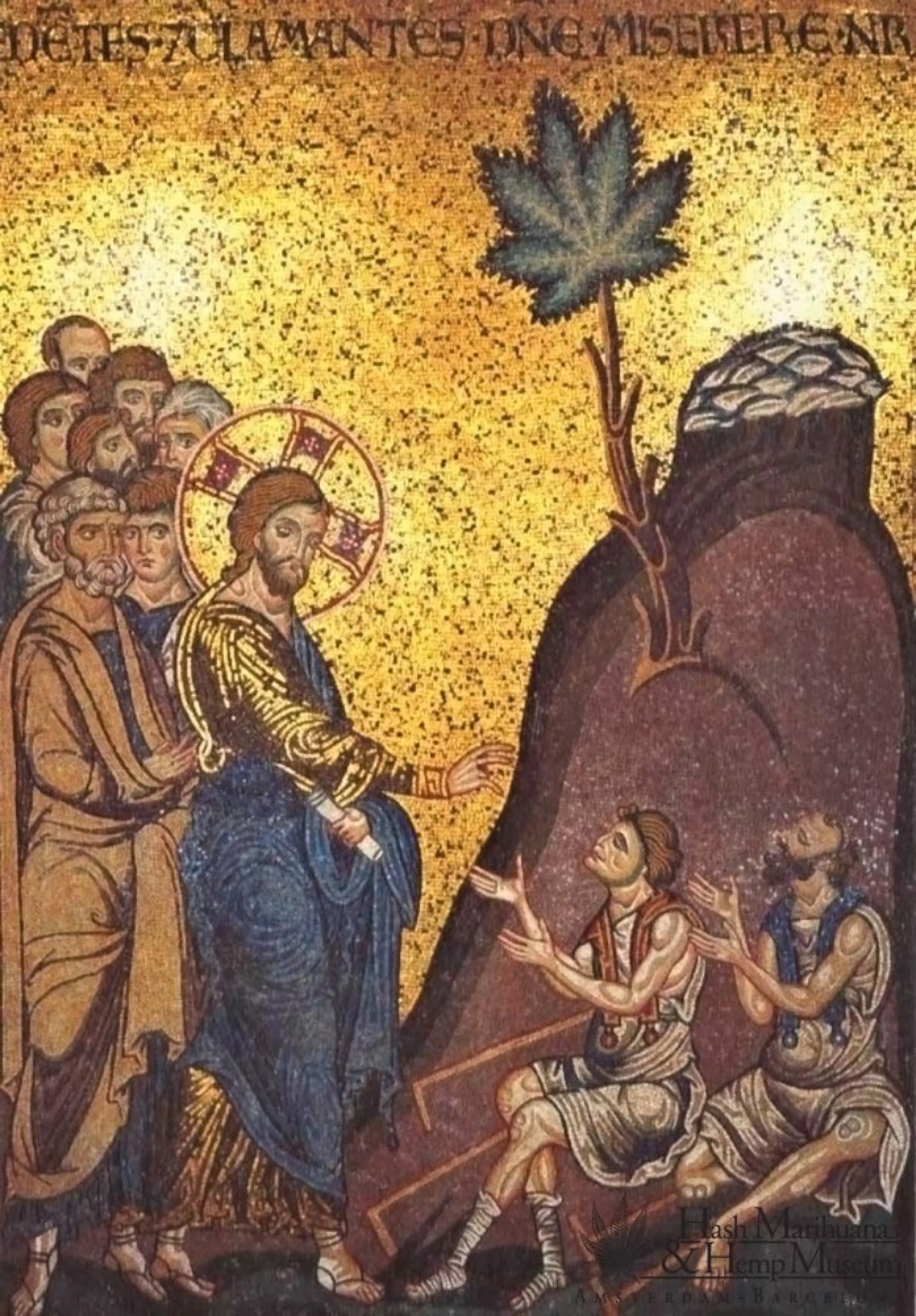 Du côté de la Bible, il est mentionné plusieurs fois l’usage du kaneh bosem, tige aromatique -dérivé du mot cannabis- comme plante médicinale utilisée parfois par Jésus sous forme d’onguent appliqué sur la tête des malades. En témoigne cette mosaïque d’une cathédrale de Sicile, dans laquelle le Christ soigne deux aveugles sous une feuille de cannabis. Des herbes et de l’encens étaient également jetés dans le feu pendant les messes ; on devait bien s’amuser à l’époque.