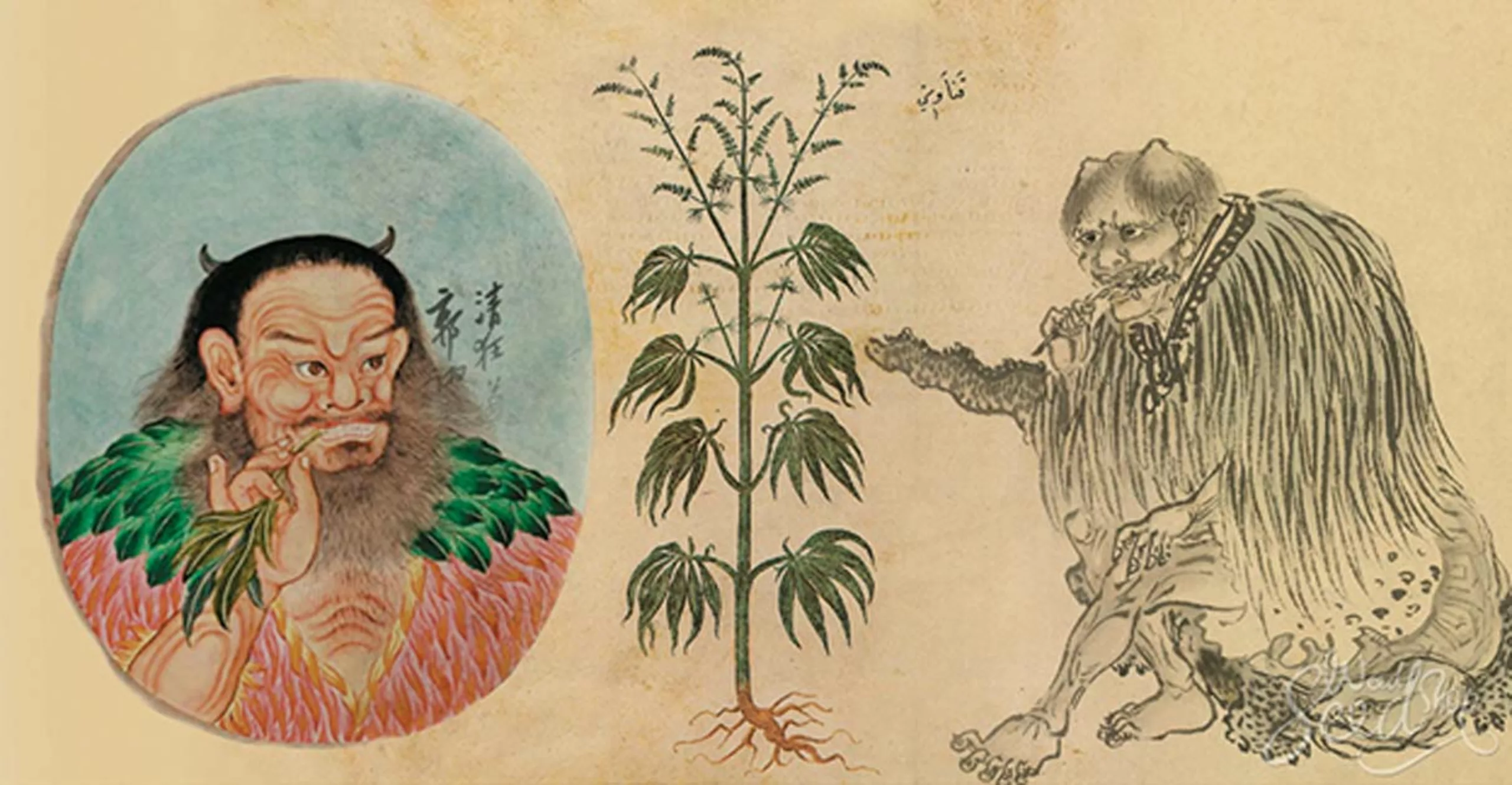 En Chine, vers 1500 avant JC, on cultivait déjà le chanvre pour ses vertus nutritives et ses fibres. Des arcs étaient réalisés avec ses tiges, révolutionnant le tir à l’arc et l’armement. Mais l’on doit surtout à la Chine les premières mentions du cannabis comme plante médicinale qui remontent, d’après les légendes, à -2800 avant J-C, puisqu’il apparaît dans l’encyclopédie herboriste de l’empereur mythique Shennong, père de la médecine chinoise. Le Shennong bencao jing, malheureusement disparu, mentionne une plante capable d’alléger le corps et de prolonger la vie. Encore aujourd’hui, son symbole Má 麻 représentant des feuilles dans un séchoir est utilisé en Chine dans des mots comme anesthésie (mazui 麻醉) ou engourdissement (mamu 麻木).
