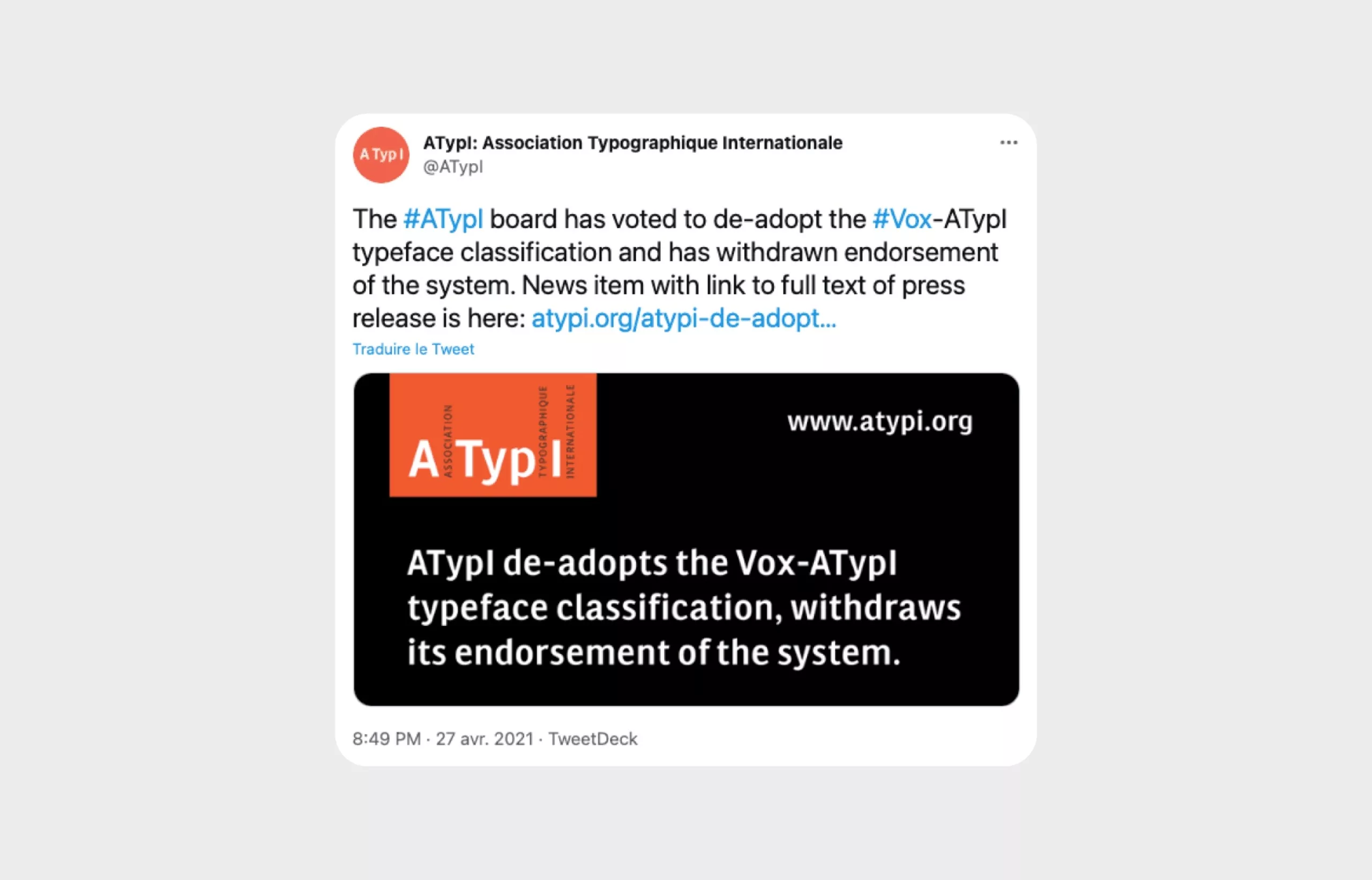 En avril 2021, l’Association Typographique Internationale (ATypI) a annoncé qu’elle renonce au système de classification Vox-ATypI et missionne un groupe de travail pour imaginer une nouvelle classification.