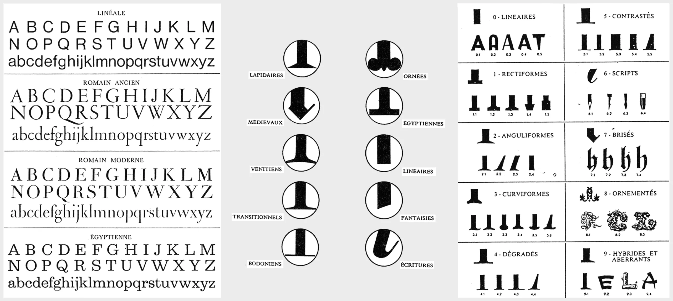 Néanmoins, les caractères et les classifications typographiques ne sont pas nés ensemble. Le besoin de classifier les typographies est apparu lorsque celles-ci sont devenues trop nombreuses, vers 1850, comme l’écrit René Ponot dans son ouvrage sur l’histoire de la Classification typographique en 1989. Romaine, bâtarde, cursive française, lettres tourneures, elzévire, gothique, fractures, égyptienne, antique, sans sérif, et autres fantaisistes… ont fait tourner la tête à bien des chercheurs et typographes.