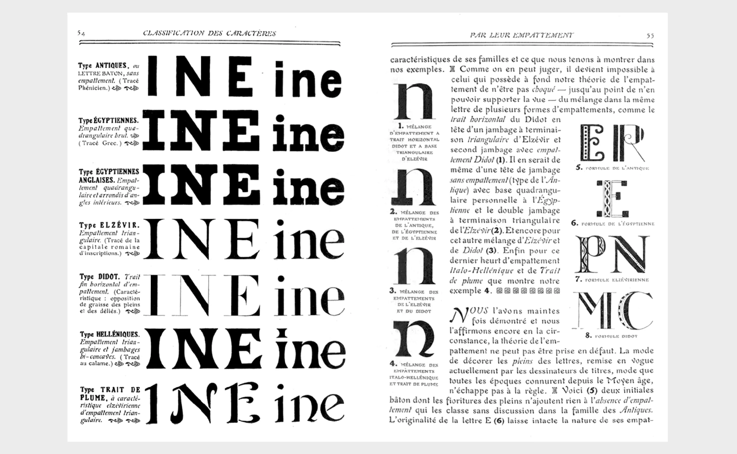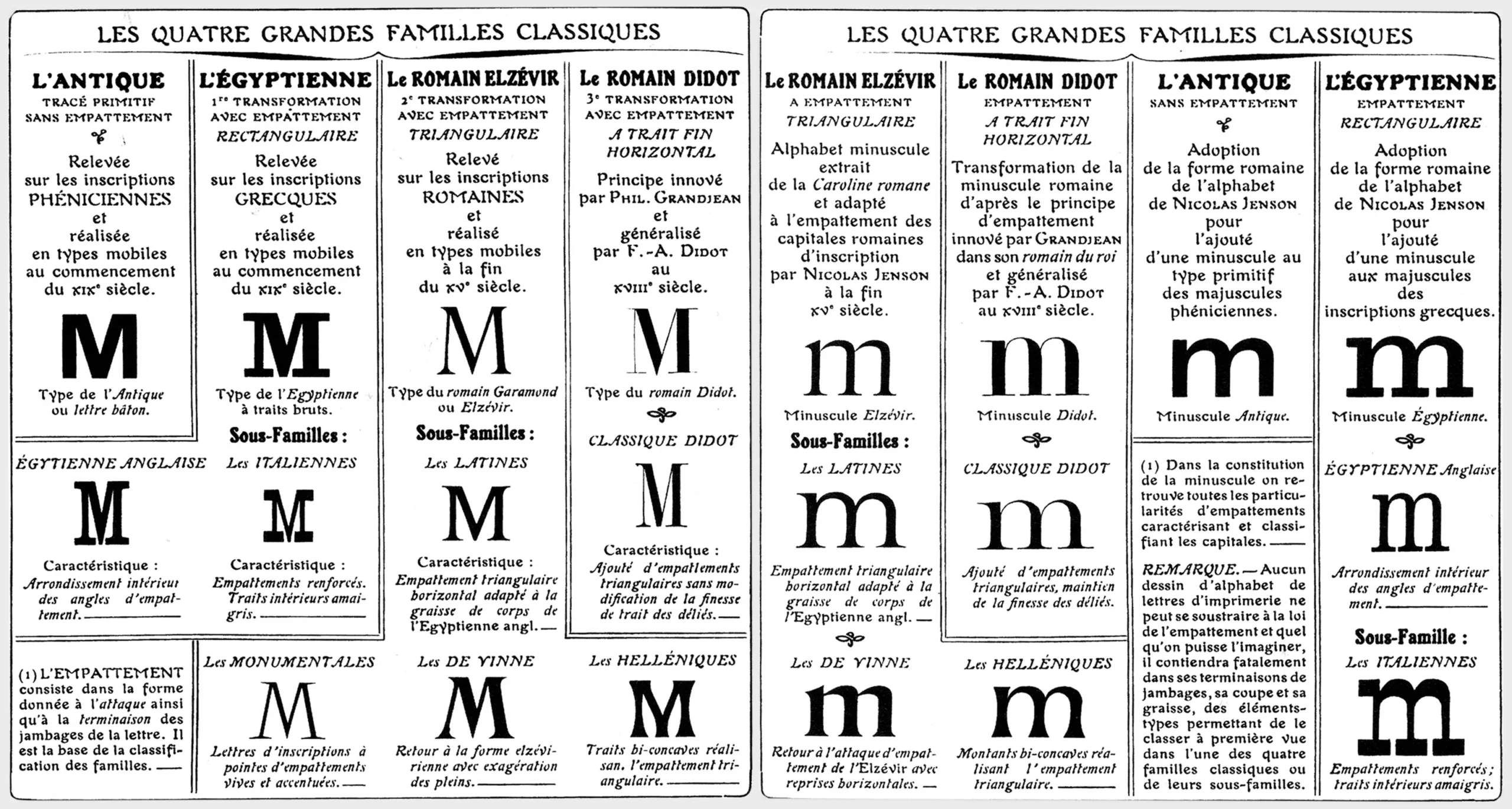 En 1921 F. Thibaudeau classifie les typographies par empattement mais également par périodes, du premier au second empire. Il distingue ainsi 4 grandes familles : “elzévir aux empattements plus ou moins triangulaires, didot lorsqu’ils sont filiformes, égyptiennes s’ils sont quadrangulaires, les antiques en étant dépourvues. Tout le reste prend place soit dans les écritures soit dans les fantaisies“. Problème ; cette classification résolument simple est vite débordée par les multiples nouvelles typographies.