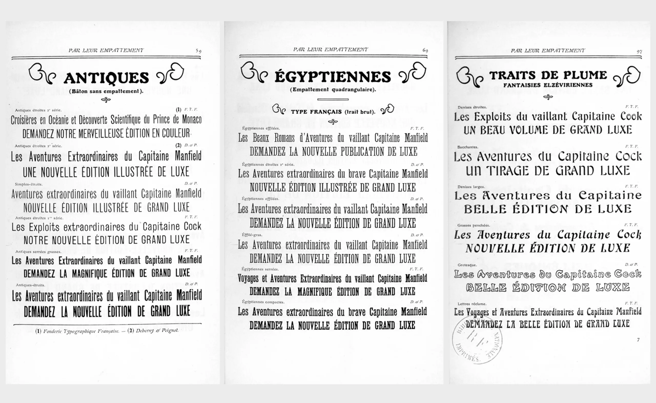 Peu de temps après, la concurrence des lettres dessinées en lithographie donne du fil à retordre aux fondeurs qui inventent tout un tas de caractères fantaisistes aux effets les plus fous (ornés, ombrés…). Après 1870, comme l’explique toujours Ponot dans son livre, ce sont les lettres étrangères et surtout les caractères Allemands qui envahissent les fonderies.