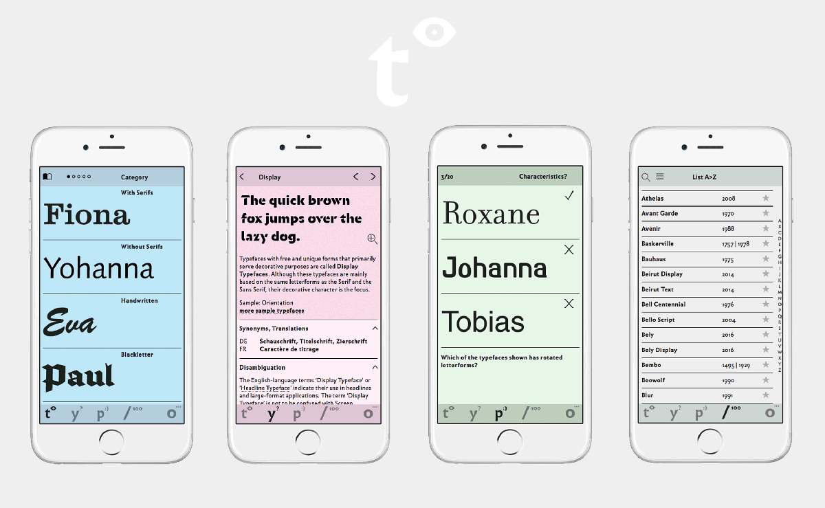 Le département de design de l’Université de Sciences Appliquées FH d’Aachen (Allemagne) a récemment conçu l’application mobile, typ/o, qui permet d’y voir plus clair dans la classification typographique mais également d’apprendre en jouant à reconnaître les typographies.