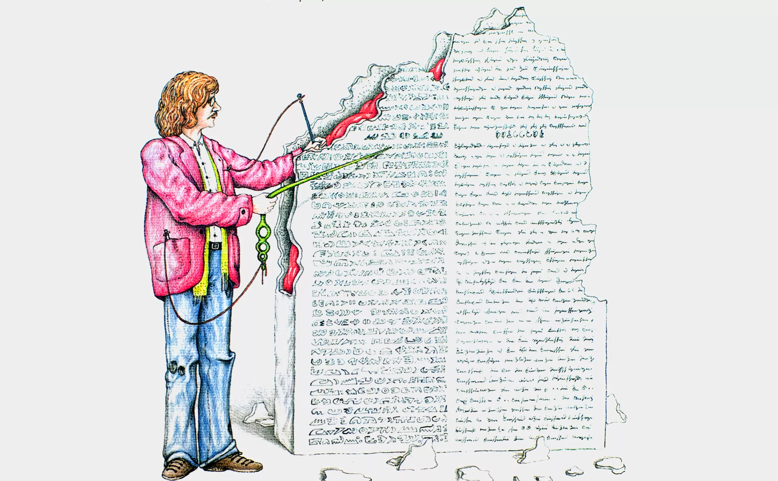 Dans le chapitre présentant l’écriture et la parole se trouve une pierre de Rosette qui répertorie non pas le grec, le démotique et les hiéroglyphes, mais deux langues imaginaires : celle du Codex Seraphinianus et une nouvelle également inventée par Luigi Serafini.