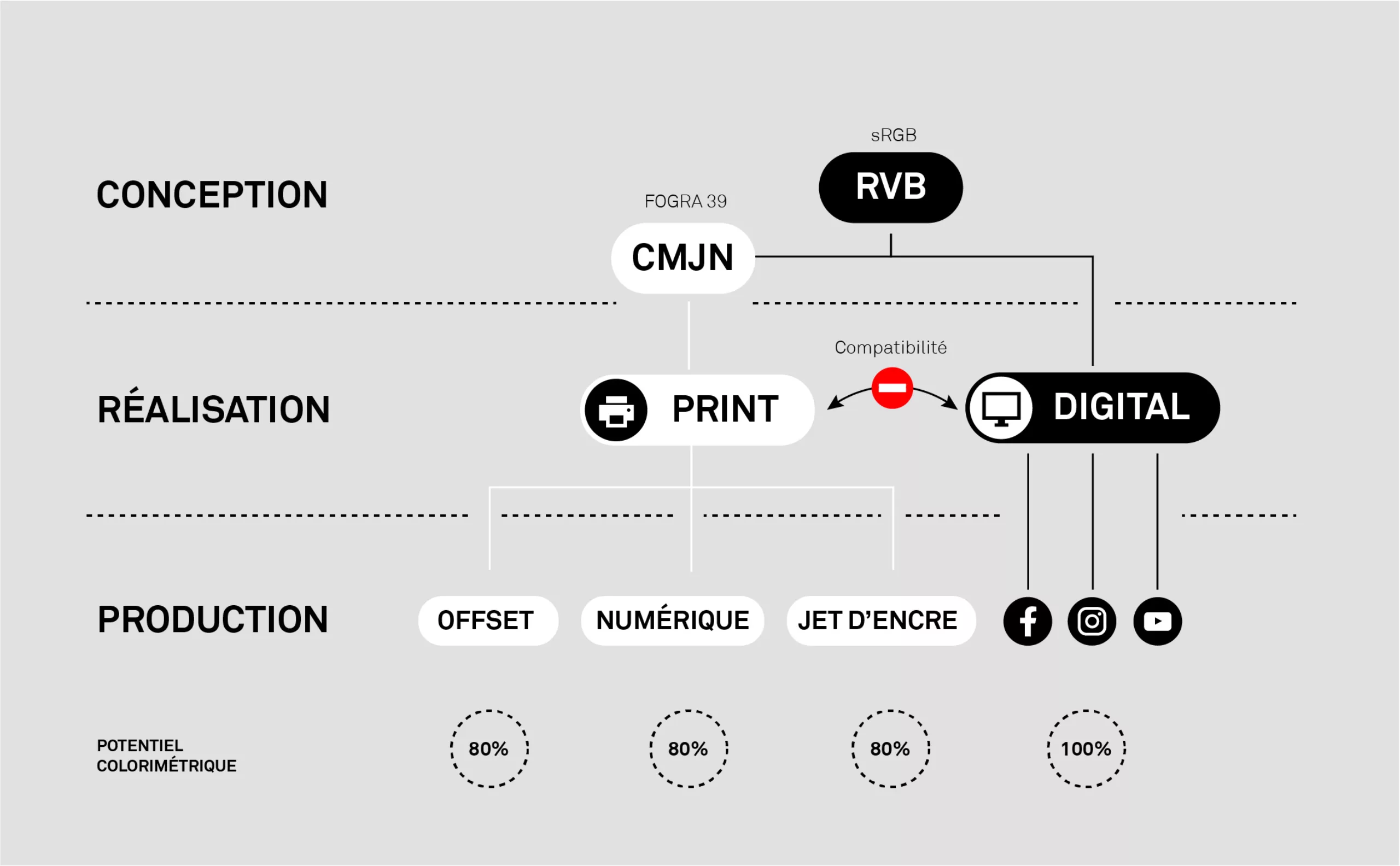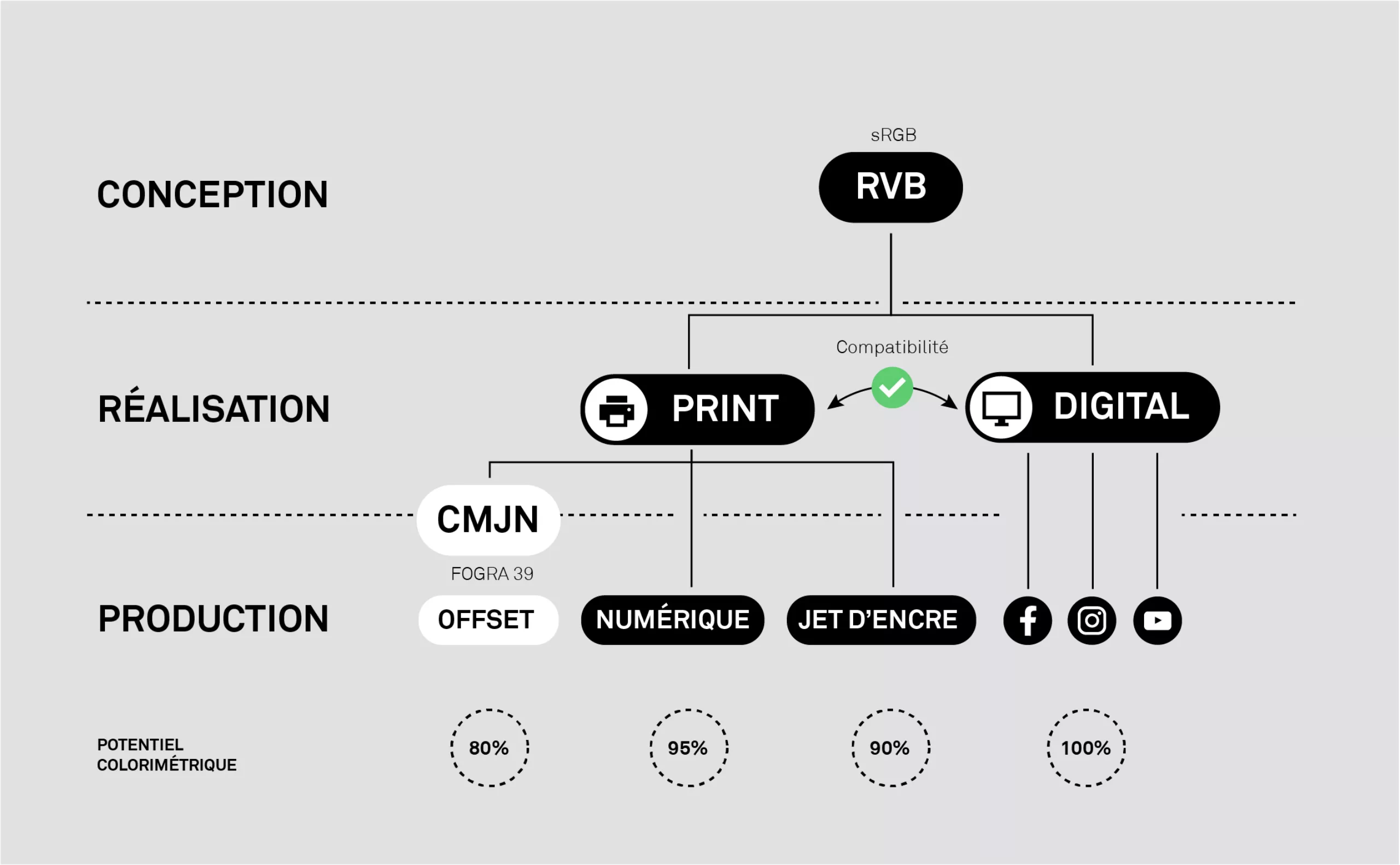 Nous pourrions commencer le flux de travail en CMJN pour être certains que la couleur soit parfaitement identique entre le print et le digital. Mais dans un monde où le digital est devenu le premier canal de diffusion pour les marques, se priver de 20% des couleurs les plus attractives nous semblera à tous très idiot. Quelle marque accepterait de ne pas jouer à armes égales vis-à-vis de ses concurrents avec des couleurs qui accrochent l’œil ? Il convient donc de commencer en RVB pour réserver la conversion en CMJN au print.