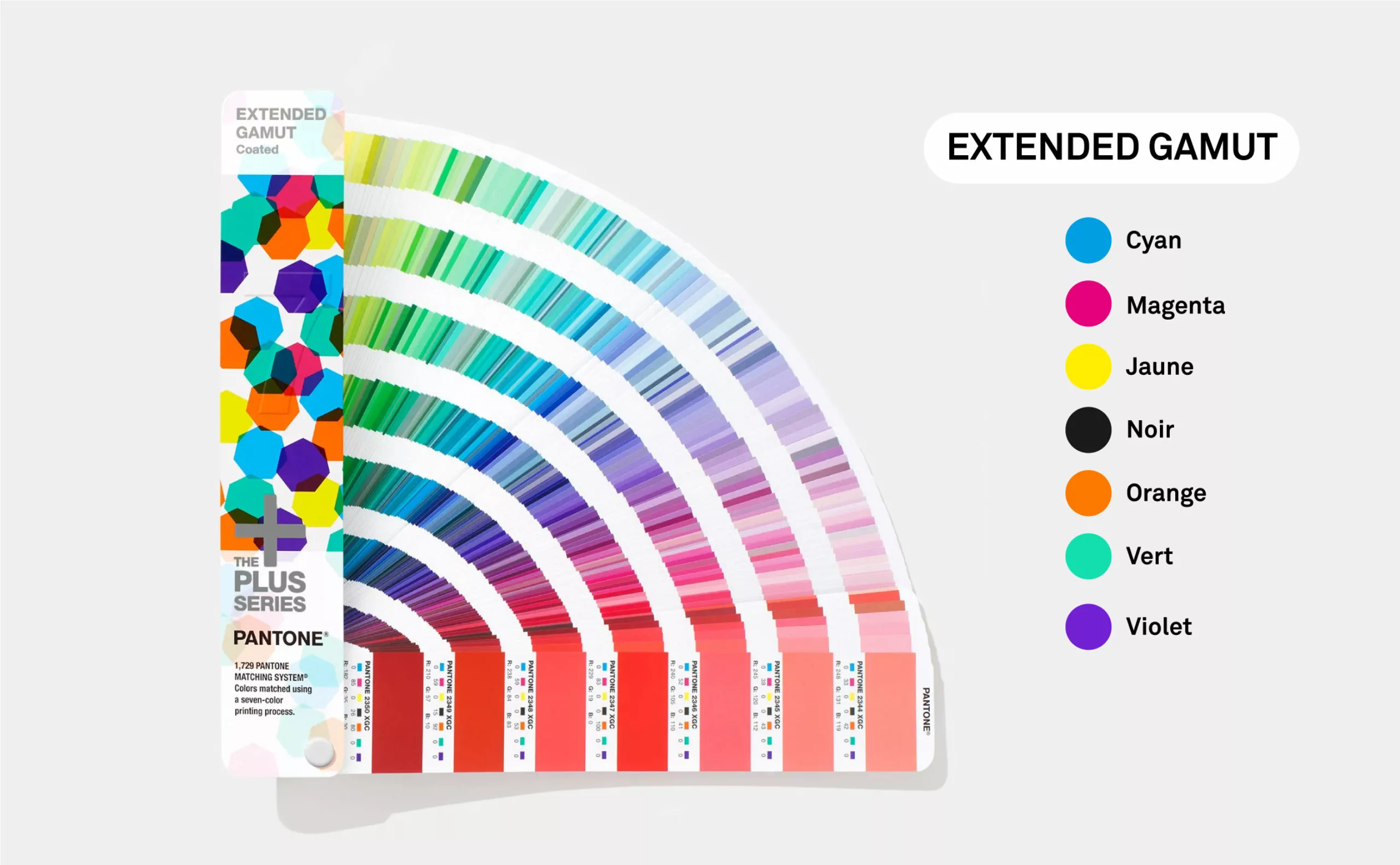Pantone fournit d’ailleurs un nuancier “Extended Gamut” où l’on retrouvera l’ensemble des références colorimétrique en 7 couleurs. On obtient ainsi un espace de couleur très vaste et on peut affirmer que la plupart des couleurs Pantone sont dans l’espace de couleur de la Multichromie avec des différences si fines petites qu’on ne les percevra pas à l’œil humain.