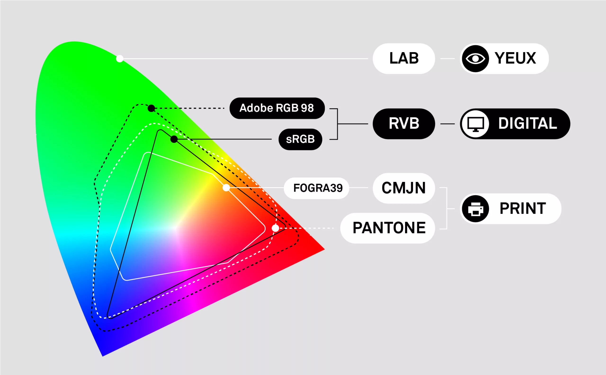 La création étant numérique, nous démarrons en RVB, et nos logiciels sont configurés en sRGB. C’est le standard le plus largement compatible avec toute la diversité des écrans. Il va garantir la correspondance optimale des couleurs entre les différents écrans.