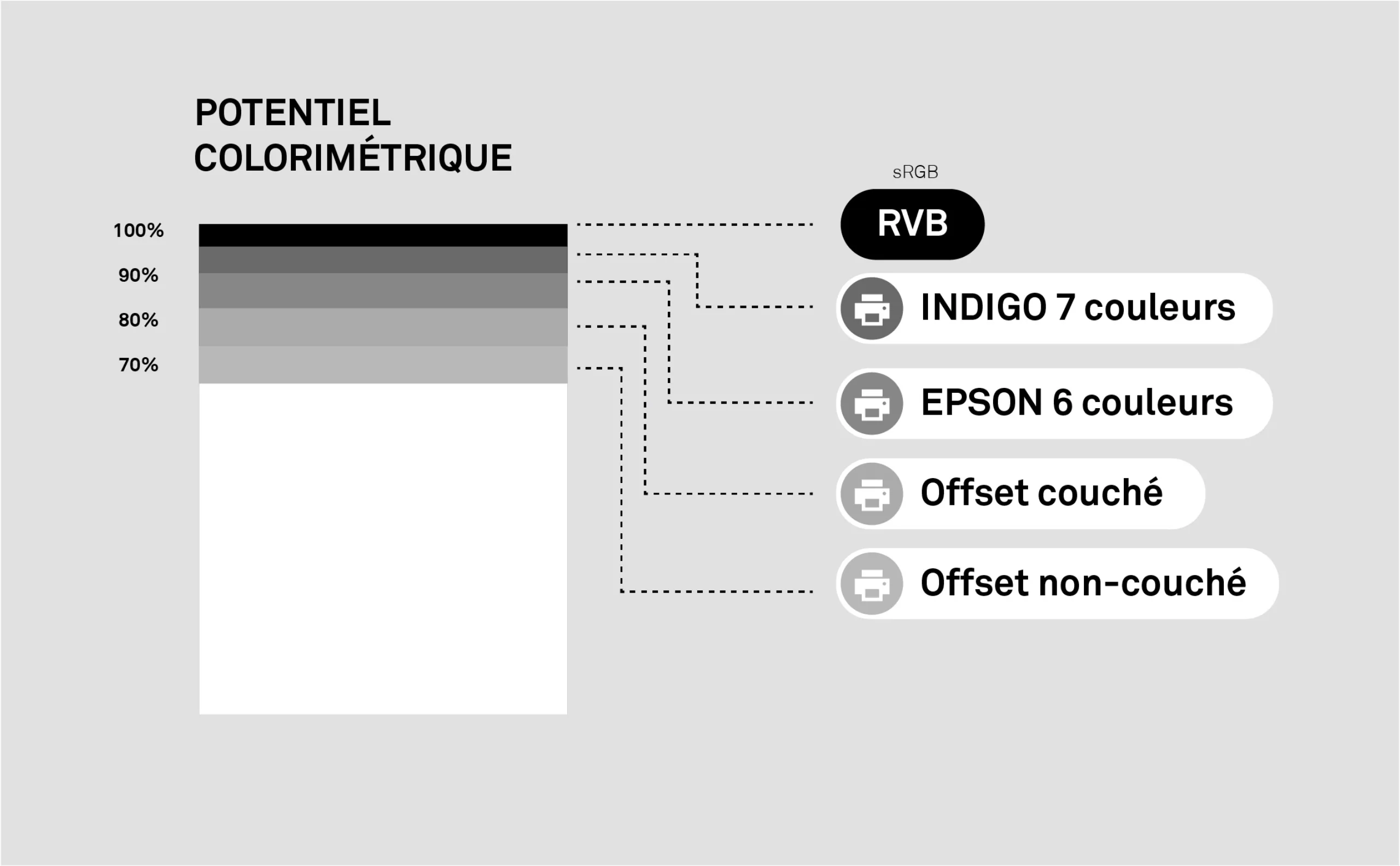 De plus, ces dernières années, ces nouveaux modes d’impressions ont beaucoup évolué, par exemple en matière de multichromie (vs quadrichromie). Par exemple aujourd’hui les traceurs jet d’encre grand format (bâches, kakémonos…) ou les presses numériques ont 6 ou 7 cartouches de couleurs (ex : cyan, magenta, jaune, noir, orange, violet et vert) qui leur permettent d’imprimer avec un gamut qui tend à se rapprocher du RVB (sRGB). D’ailleurs les presses numériques HP INDIGO récentes sont vendues pour imprimer jusqu’à 97% des couleurs Pantone. Autre exemple, Konica revendique d’imprimer 89% des couleurs Pantone. Dès lors, pourquoi leur donner du CMJN en entrée, alors qu’on peut imprimer de véritables pâtisseries RVB !