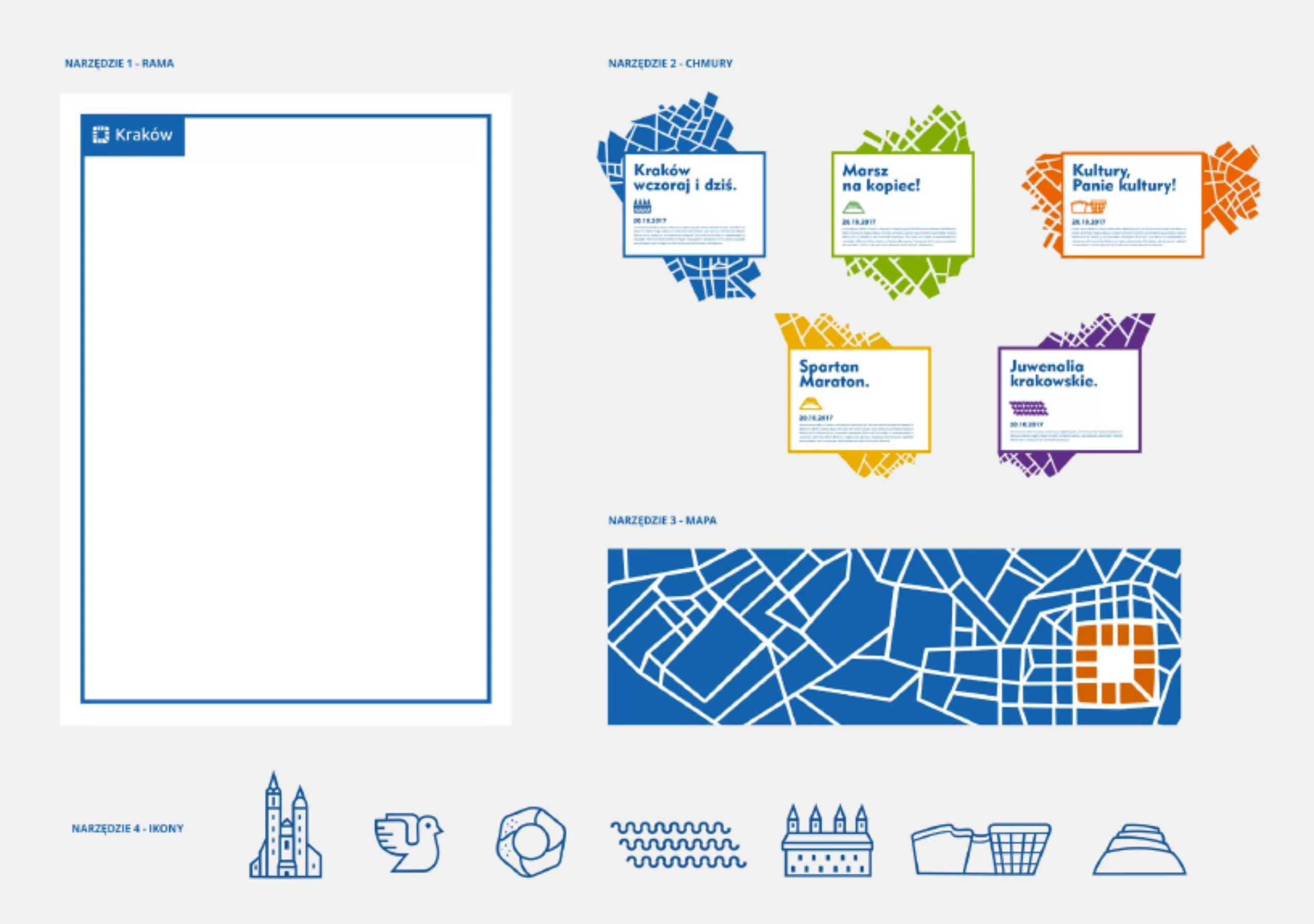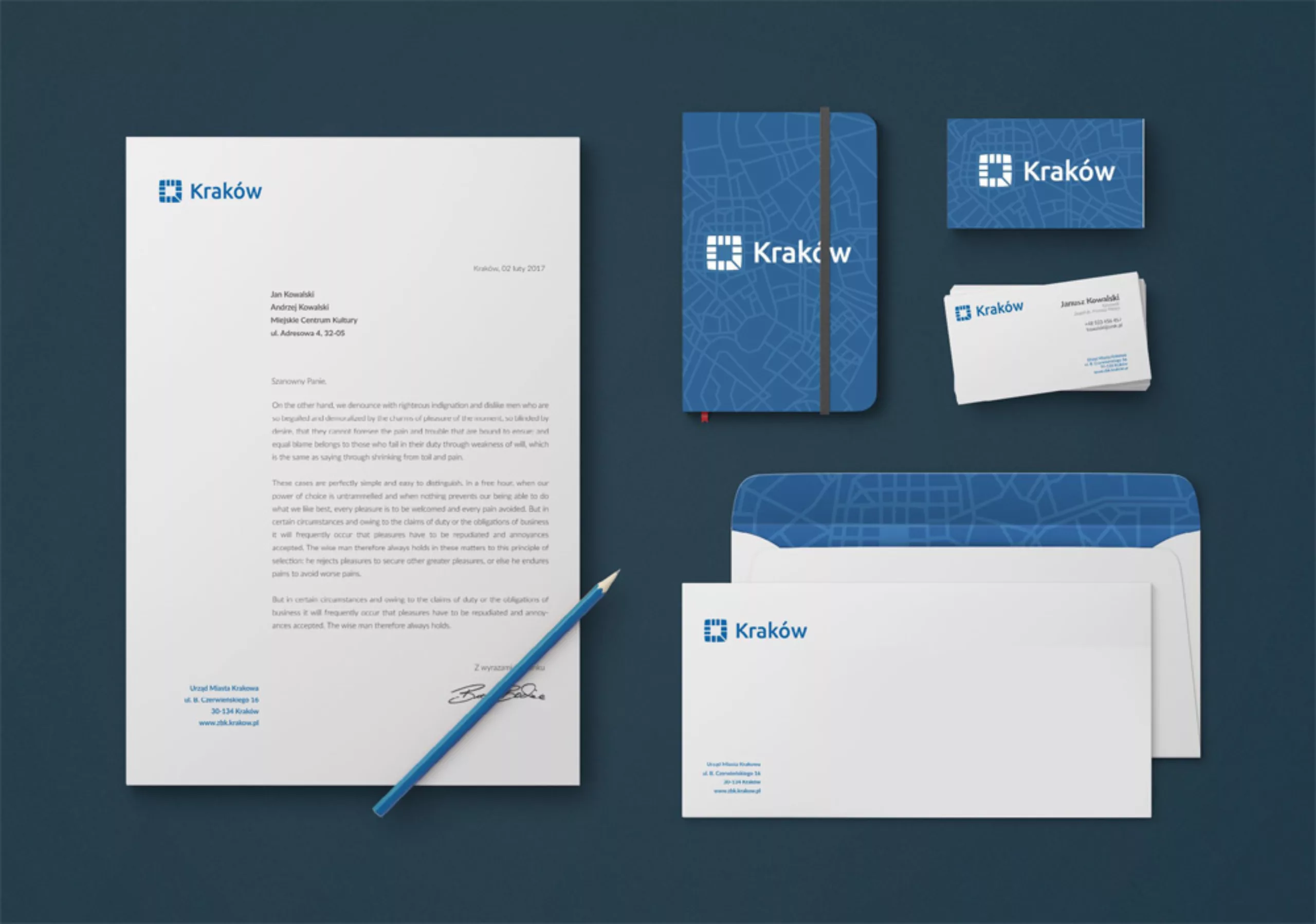 Ensuite, le nom de la ville, originellement inscrit en latin “Cracovia” puis changé en 2011 par la version polonaise “Krakow”, sort de son symbole et va se placer à côté. Cette séparation est loin d’être anodine car elle permet ainsi au symbole d’être utilisé indépendamment en bouton, icône d’application, favicon etc., facilité de par sa forme carrée arrondie. Côté typo, c’est du local qui a été retenu, puisque Dorota Kozak a choisi d’utiliser la Pusia, dessinée en 2016 par Roch Modrzejewski du studio ROHH, basé à Cracovie. Une police de caractère qui rappelle énormément la Ubuntu.