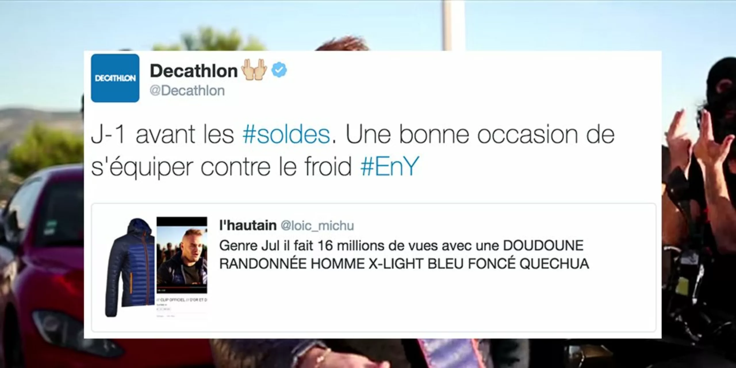 Et si la fameuse doudoune Quechua fait un tabac dans les cités, c’est qu’un certain rappeur dénommé Jul en a fait sa tenue de scène. Au point d’être rebaptisée Kalenjul, pour les intimes. En 2015 il s’affiche en Décathlon dans son clip En Y, vu 64 millions de fois sur YouTube. Il parle ouvertement de la marque dans sa chanson JCVD : “Pochon dans le sac Quechua, claquettes, coupons, séchoirs / J’ai envie de rôder le soir, mais dans la vie faut faire des choix.”