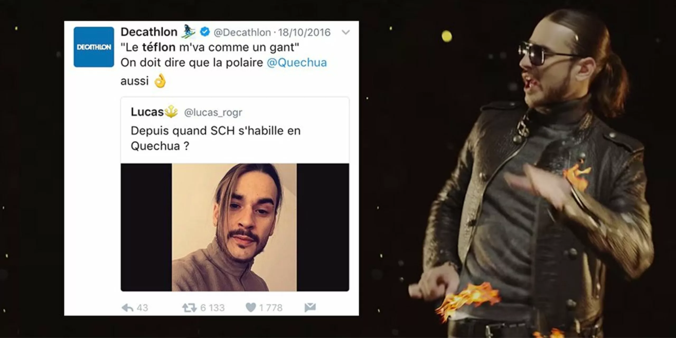 Le community manager de Décathlon précise que les rappeurs leur font des clins d’œil d’eux-mêmes, sur lesquels il n’hésite pas à rebondir. On l’a vu échanger sur twitter avec RK qui chantait “Eh, fallait faire un choix. J’ai opté pour Versace, j’oublie la Quechua. Eh, j’suis resté l’même depuis l’départ. On rigole plus, reste à ta place” dans son titre #DansLeTierquar (Nantes), ce qui a donné lieu à cet échange :
