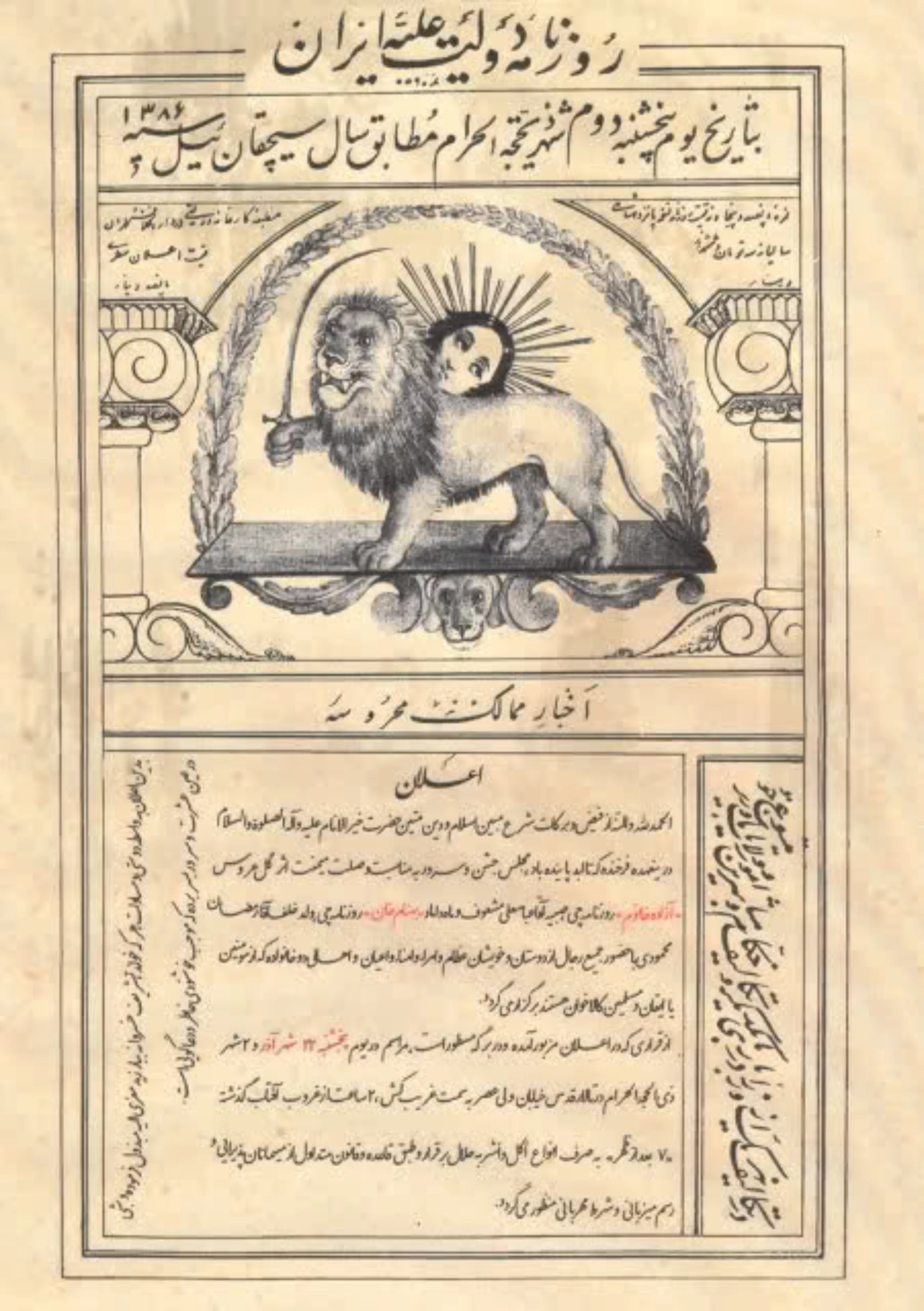 La première presse à lithographie arrive en Iran en 1821, deux ans seulement après l’arrivée de cette technologie aux États-Unis. En dessinant sur une pierre, ce support permet aux artistes de composer manuellement motifs, caricatures et calligraphies sans contraintes de typographies ou de mise en page, et à moindre coût par rapport à l’imprimerie classique. Le premier livre est imprimé 11 ans plus tard -en lithographie- et de nombreuses publications Européennes seront traduites dans la foulée, dans un élan de modernisation et d’ouverture au monde. Les journaux utiliseront ensuite cette technologie.