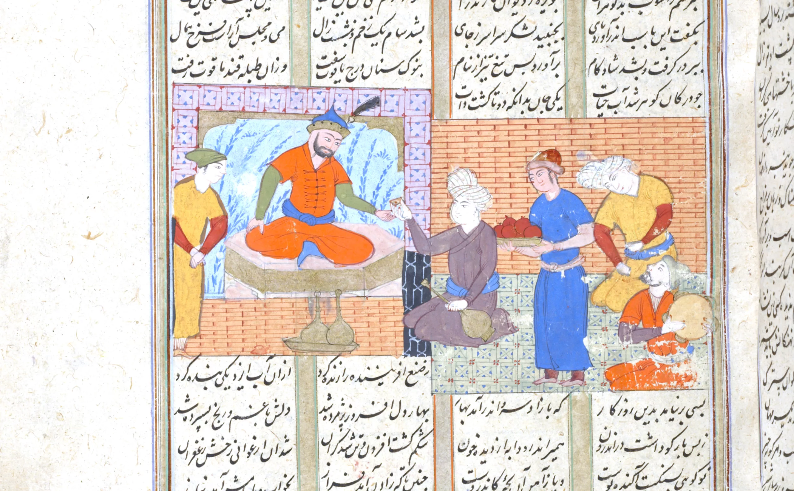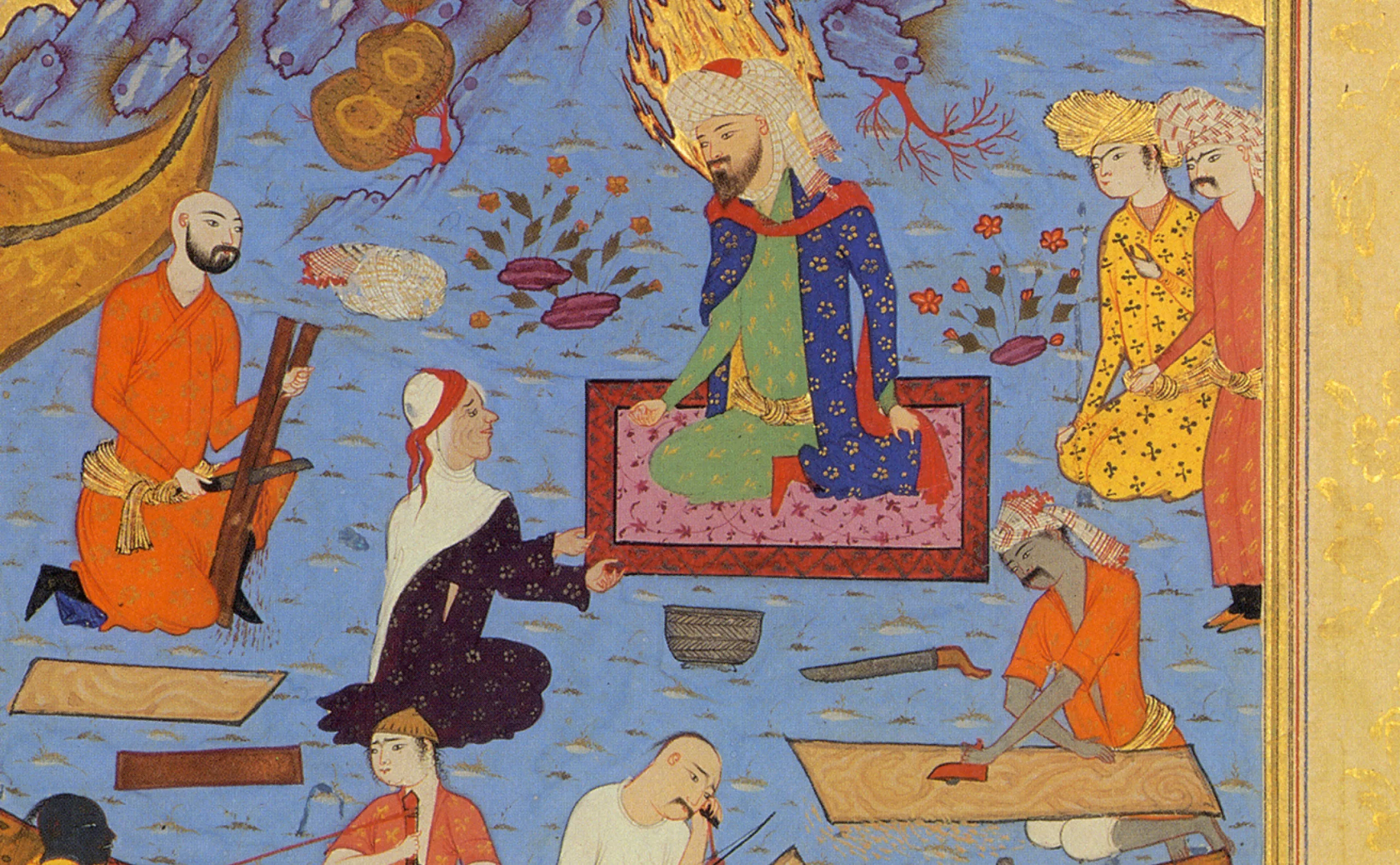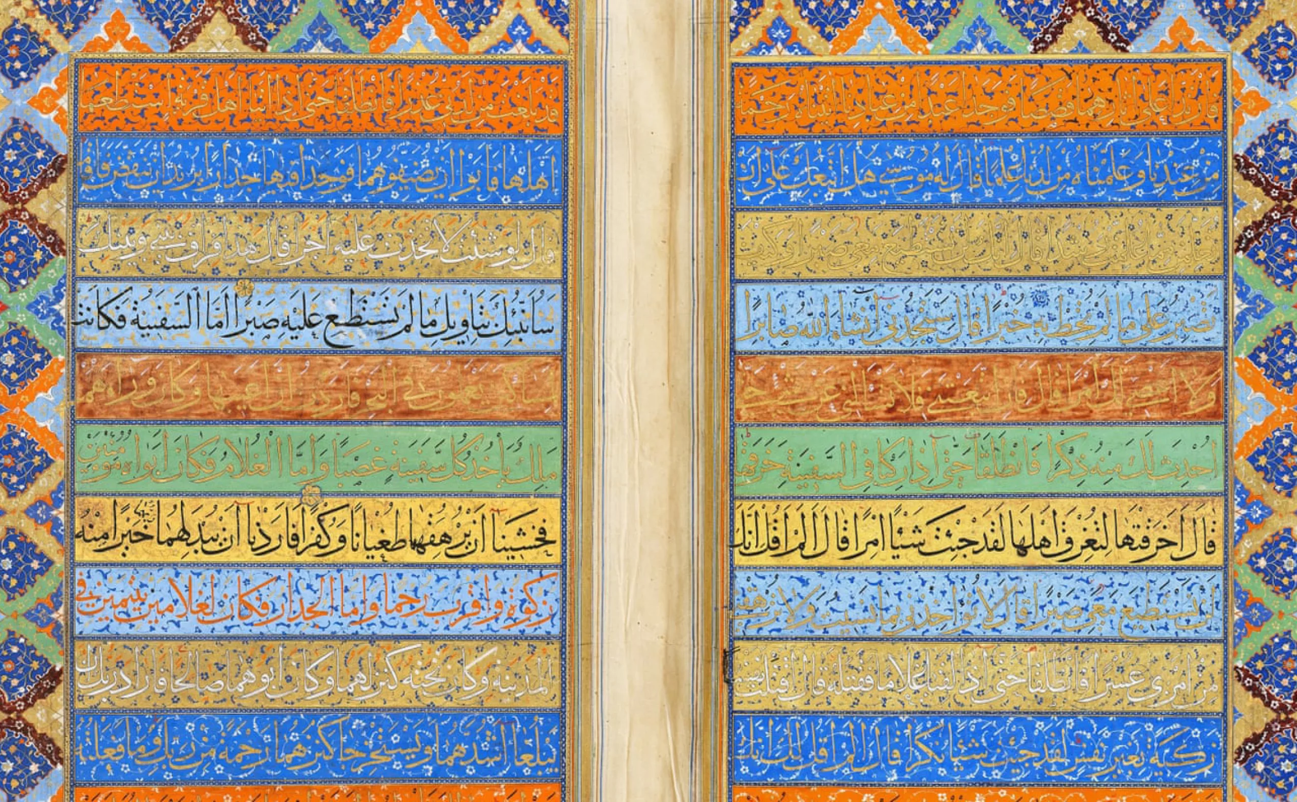 Basée sur le Coran, la religion musulmane produit un grand nombre de miniatures représentant des personnages. Peu à peu, les représentations de visages dans les textes pieux disparaissent et sont laissés vides. Les mots du Coran sont alors prétextes à des ornements particulièrement dévoués. Les enluminures et la calligraphie subliment ainsi les mots sacrés dans les premiers livres, avec de l’or, des jeux d’encres et de papiers. À tel point que l’art calligraphique est encore considéré comme le plus abouti des arts appliqués de l’Islam, et très utilisé dans le graphisme iranien.